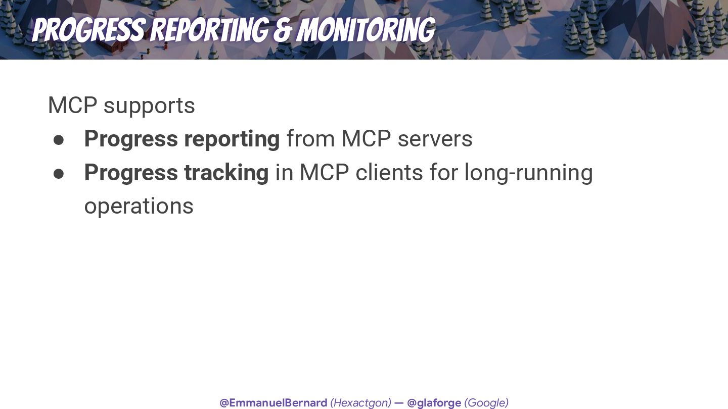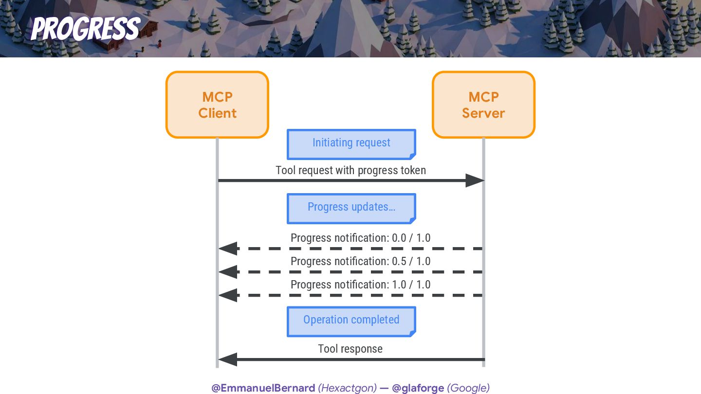 46. @EmmanuelBernard (Hexactgon) — @glaforge (Google) MCP supports • Progress reporting