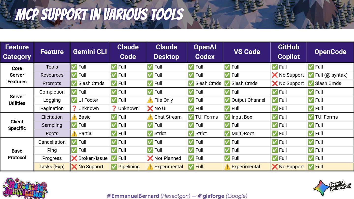 Feature Category Feature Gemini CLI Claude Code Claude Desktop OpenAI Codex VS Code GitHub Copilot OpenCode Core Server Features Tools ✅ Full ✅ Full ✅ Full ✅ Full ✅ Full ✅ Full ✅ Full Resources ✅ Full ✅ Full ✅ Full ✅ Full ✅ Full ❌ No Support ✅ Full (@ syntax) Prompts ✅ Slash Cmds ✅ Full ✅ Full ✅ Slash Cmds ✅ Slash Cmds ❌ No Support ✅ Slash Cmds Server Utilities Completion ✅ Full ✅ Full ✅ Full ✅ Full ✅ Full ✅ Full ✅ Full Logging ✅ UI Footer ✅ Full ⚠ File Only ✅ Full ✅ Output Channel ✅ Full ✅ Full Pagination ❓ Unknown ❓ Unknown ❌ No UI ✅ Full ✅ Full ✅ Full ✅ Full Client Specific Elicitation ⚠ Basic ✅ Full ⚠ Chat Stream ✅ TUI Forms ✅ Input Box ✅ Full ✅ TUI Forms Sampling ✅ Full ✅ Full ✅ Full ✅ Full ✅ Full ✅ Full ✅ Full Roots ⚠ Partial ✅ Full ✅ Strict ✅ Strict ✅ Multi-Root ✅ Full ✅ Full Base Protocol Cancellation ✅ Full ✅ Full ✅ Full ✅ Full ✅ Full ✅ Full ✅ Full Ping ✅ Full ✅ Full ✅ Full ✅ Full ✅ Full ✅ Full ✅ Full Progress ❌ Broken/Issue ✅ Full ❌ Not Planned ✅ Full ✅ Full ✅ Full ✅ Full Tasks (Exp) ❌ No Support ✅ Pipelining ⚠ Experimental ✅ Full ⚠ Experimental ❌ No Support ✅ Full