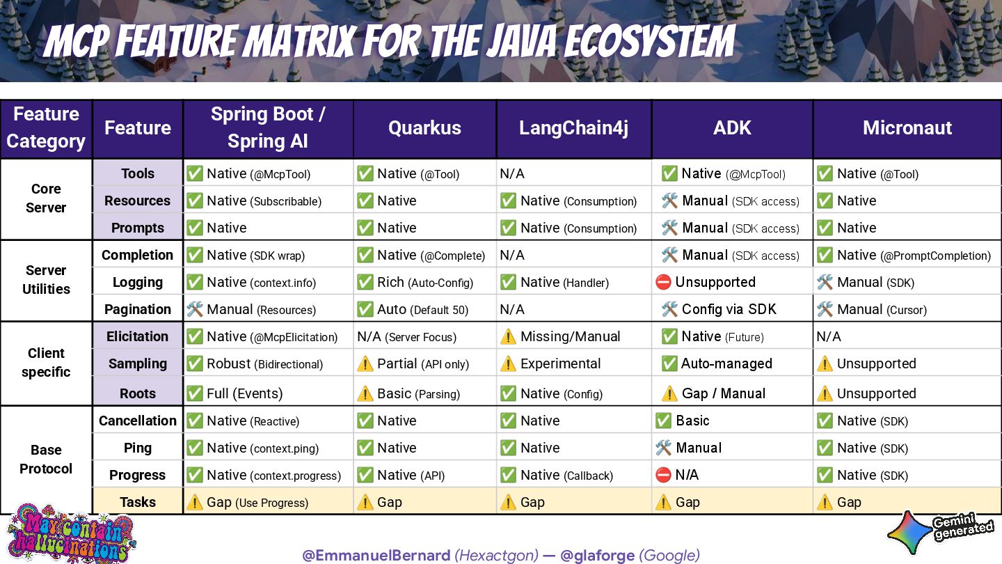 Java ecosystem Feature Category Feature Spring Boot / Spring AI Quarkus LangChain4j ADK Micronaut Core Server Tools ✅ Native (@McpTool) ✅ Native (@Tool) N/A ✅ Native (@McpTool) ✅ Native (@Tool) Resources ✅ Native (Subscribable) ✅ Native ✅ Native (Consumption) 🛠 Manual (SDK access) ✅ Native Prompts ✅ Native ✅ Native ✅ Native (Consumption) 🛠 Manual (SDK access) ✅ Native Server Utilities Completion ✅ Native (SDK wrap) ✅ Native (@Complete) N/A 🛠 Manual (SDK access) ✅ Native (@PromptCompletion) Logging ✅ Native (context.info) ✅ Rich (Auto-Config) ✅ Native (Handler) ⛔ Unsupported 🛠 Manual (SDK) Pagination 🛠 Manual (Resources) ✅ Auto (Default 50) N/A 🛠 Config via SDK 🛠 Manual (Cursor) Client specific Elicitation ✅ Native (@McpElicitation) N/A (Server Focus) ⚠ Missing/Manual ✅ Native (Future) N/A Sampling ✅ Robust (Bidirectional) ⚠ Partial (API only) ⚠ Experimental ✅ Auto-managed ⚠ Unsupported Roots ✅ Full (Events) ⚠ Basic (Parsing) ✅ Native (Config) ⚠ Gap / Manual ⚠ Unsupported Base Protocol Cancellation ✅ Native (Reactive) ✅ Native ✅ Native ✅ Basic ✅ Native (SDK) Ping ✅ Native (context.ping) ✅ Native ✅ Native 🛠 Manual ✅ Native (SDK) Progress ✅ Native (context.progress) ✅ Native (API) ✅ Native (Callback) ⛔ N/A ✅ Native (SDK) Tasks ⚠ Gap (Use Progress) ⚠ Gap ⚠ Gap ⚠ Gap ⚠ Gap