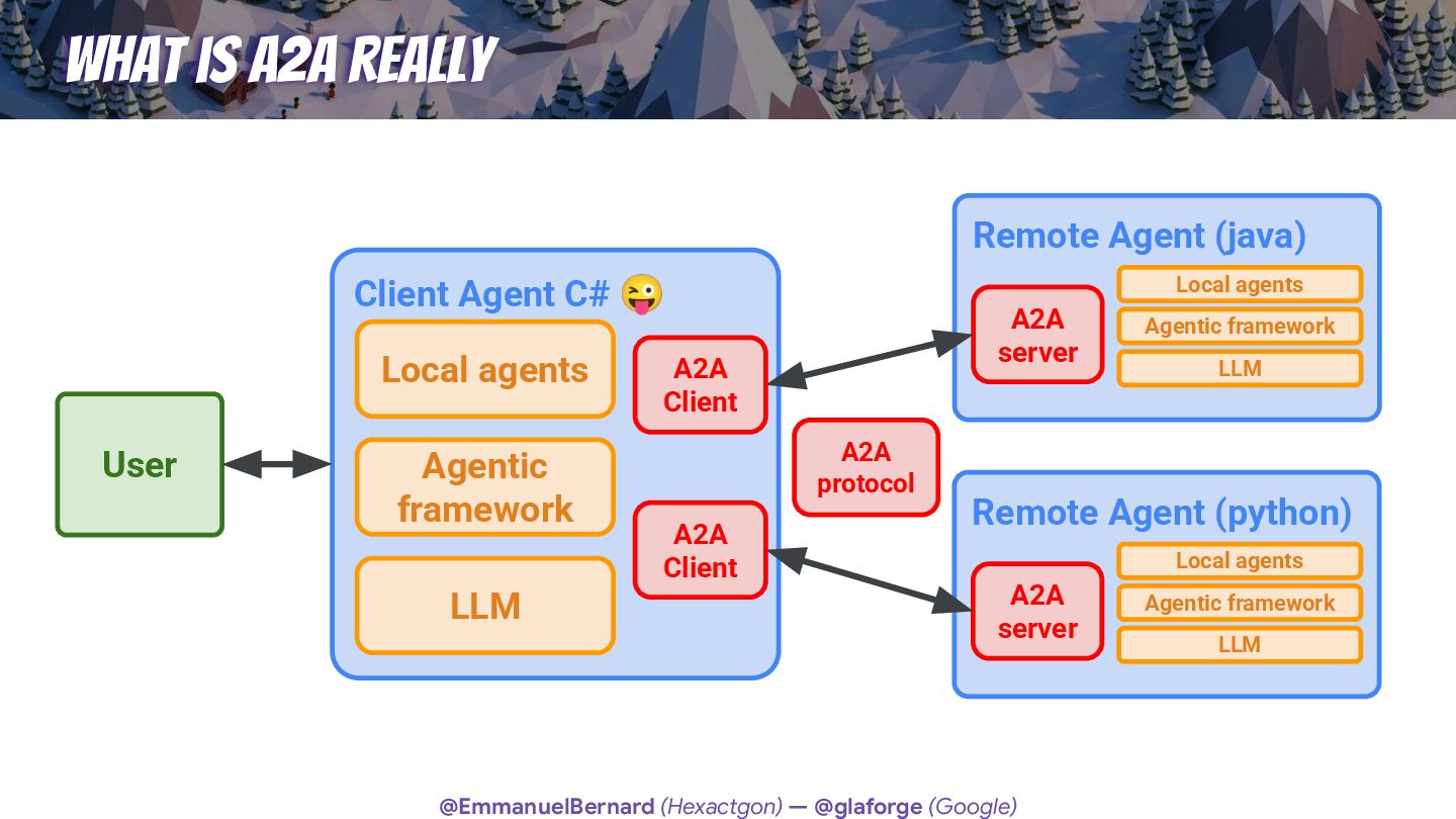 User Client Agent C# 😜 Local agents Agentic framework LLM Remote Agent (java) Local agents Agentic framework LLM A2A Client A2A Client A2A protocol A2A server Remote Agent (python) Local agents Agentic framework LLM A2A server MCP tool MCP tool API and enterprise apps MCP tool MCP tool API and enterprise apps MCP tool API and enterprise apps