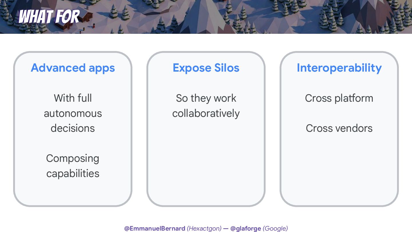 full autonomous decisions Composing capabilities Expose Silos So they work collaboratively Interoperability Cross platform Cross vendors