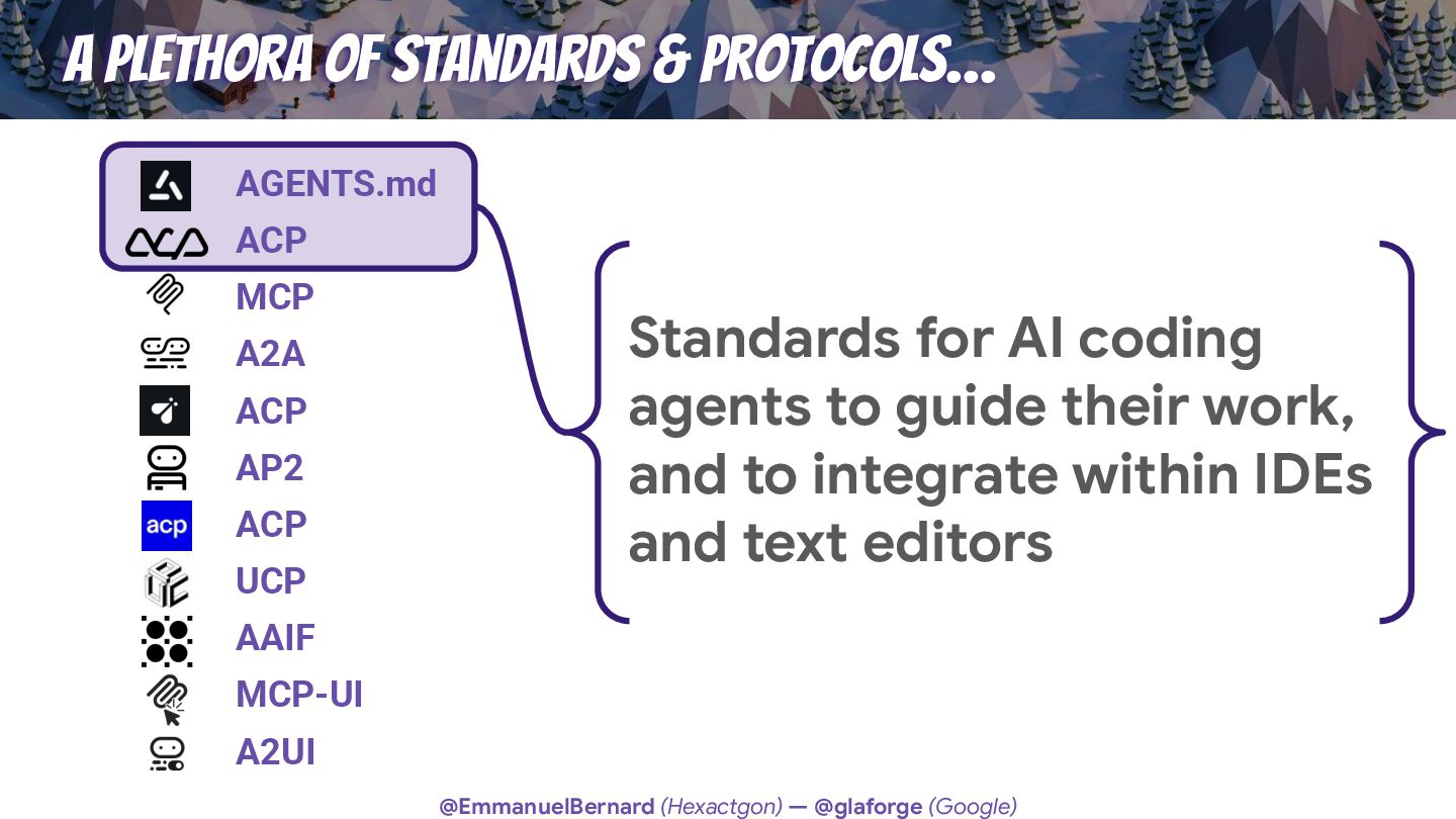 Protocols… AGENTS.md ACP MCP A2A ACP AP2 ACP UCP AAIF MCP-UI A2UI Standards for AI coding agents to guide their work, and to integrate within IDEs and text editors