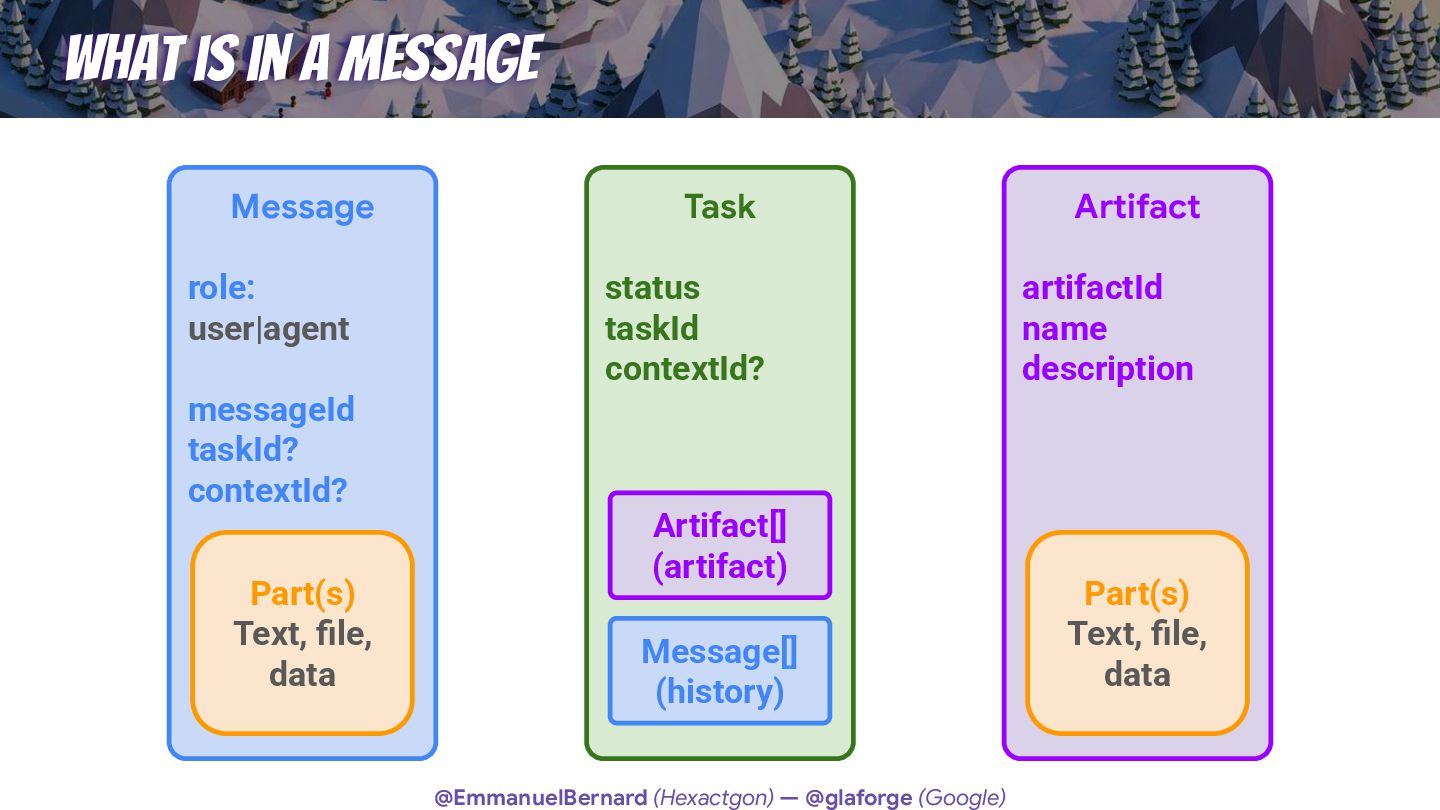 Message role: user|agent messageId taskId? contextId? Part(s) Text, file, data Task status taskId contextId? Artifact[] (artifact) Message[] (history) Artifact artifactId name description Part(s) Text, file, data