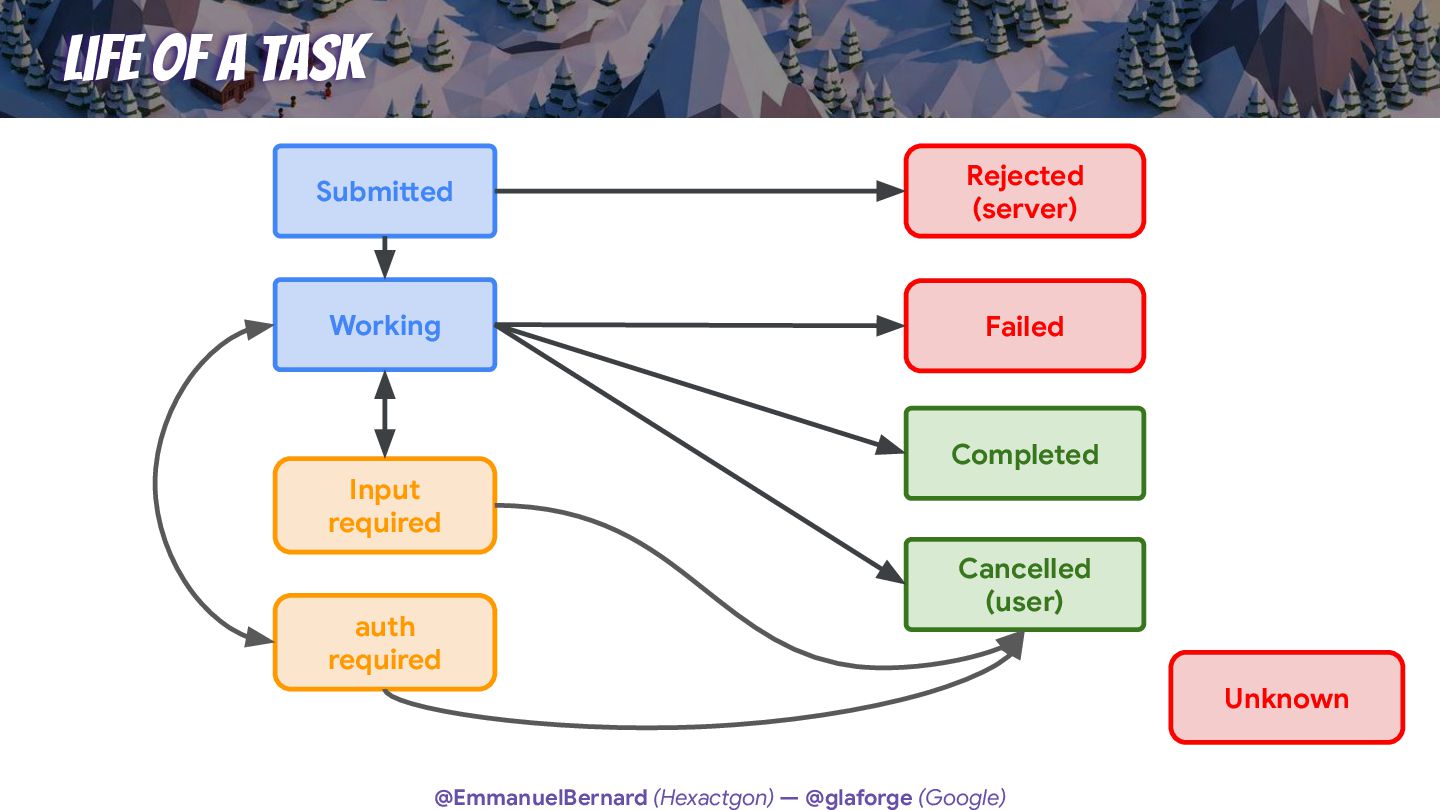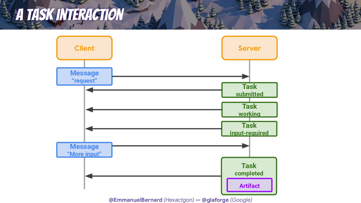Message “request” Task submitted Task working Message “More input” Task completed Artifact Task input-required