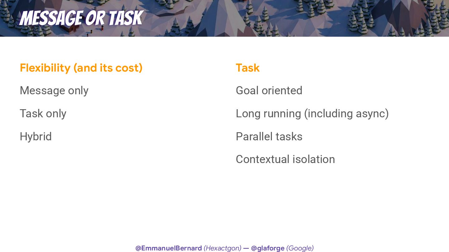oriented Long running (including async) Parallel tasks Contextual isolation Flexibility (and its cost) Message only Task only Hybrid