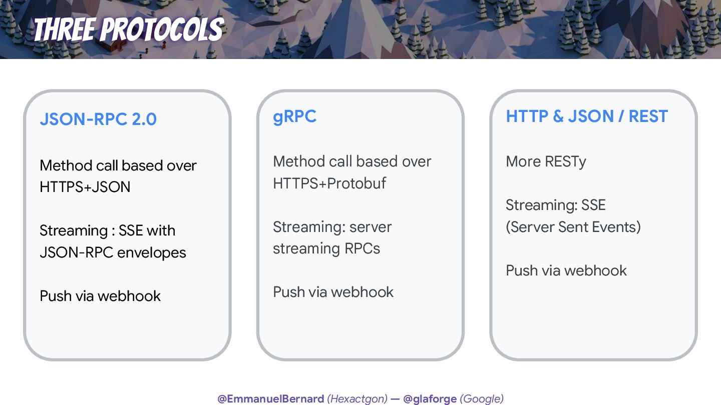 call based over HTTPS+JSON Streaming : SSE with JSON-RPC envelopes Push via webhook gRPC Method call based over HTTPS+Protobuf Streaming: server streaming RPCs Push via webhook HTTP & JSON / REST More RESTy Streaming: SSE (Server Sent Events) Push via webhook