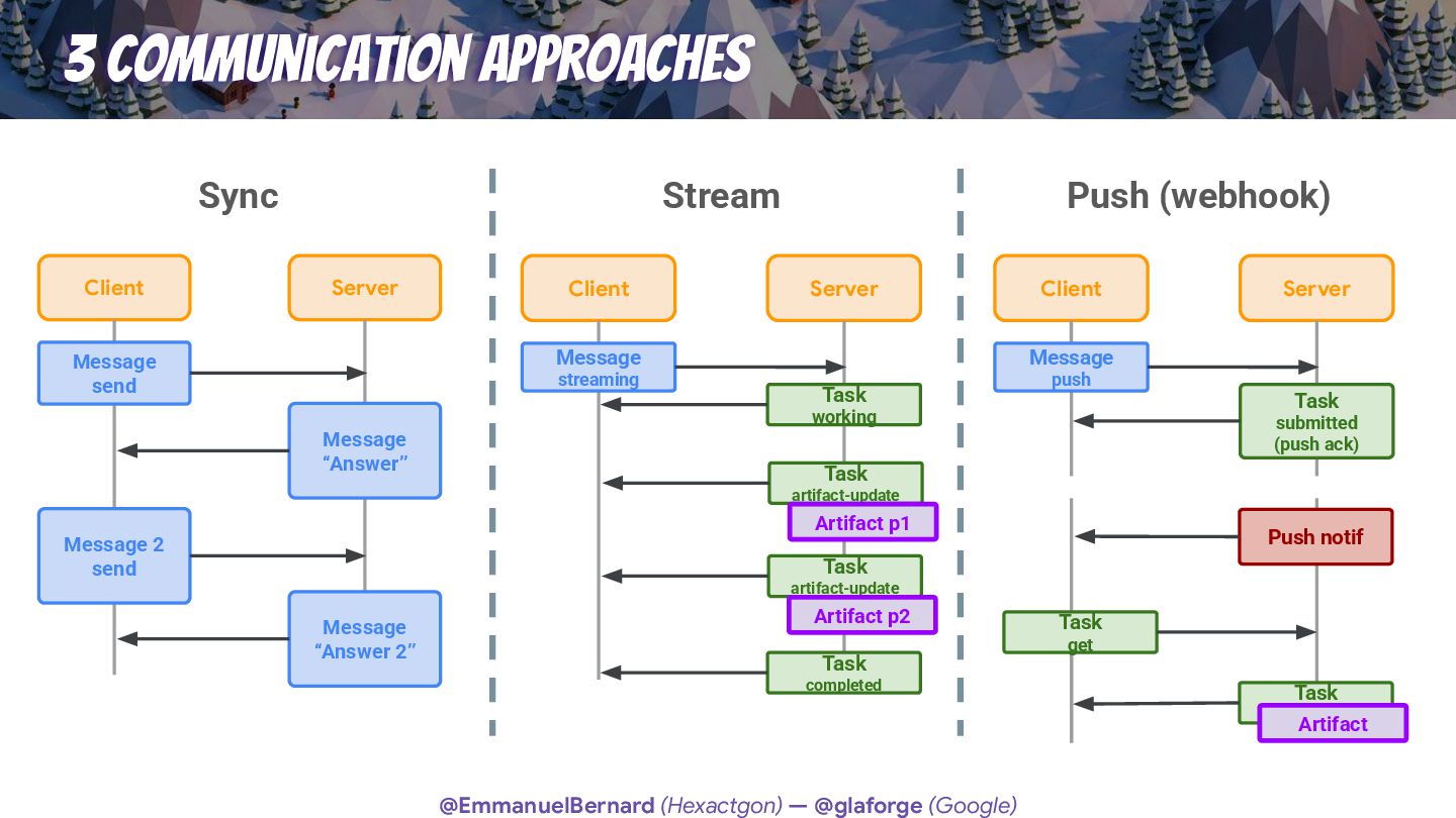 Message send Message “Answer” Message 2 send Message “Answer 2” Client Server Message streaming Task working Task artifact-update Artifact p2 Client Server Message push Task submitted (push ack) Task get Task input-needed Artifact Push notif Task artifact-update Artifact p1 Task completed Sync Stream Push (webhook)