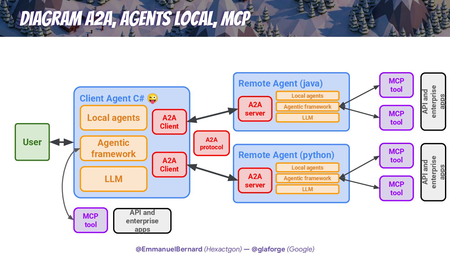 64. @EmmanuelBernard (Hexactgon) — @glaforge (Google) Diagram A2A, agents local, MCP