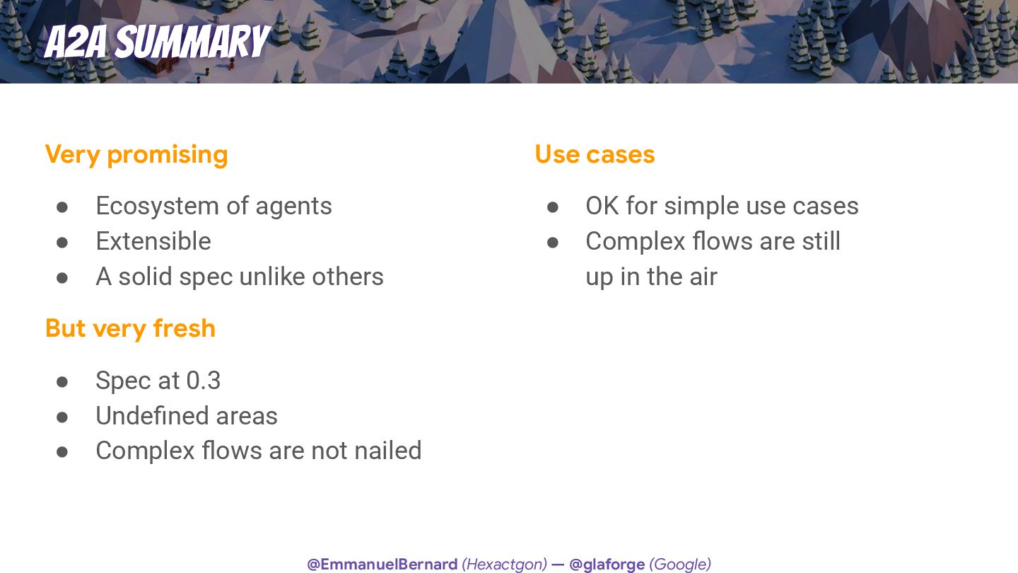 OK for simple use cases • Complex flows are still up in the air Very promising • Ecosystem of agents • Extensible • A solid spec unlike others But very fresh • Spec at 0.3 • Undefined areas • Complex flows are not nailed