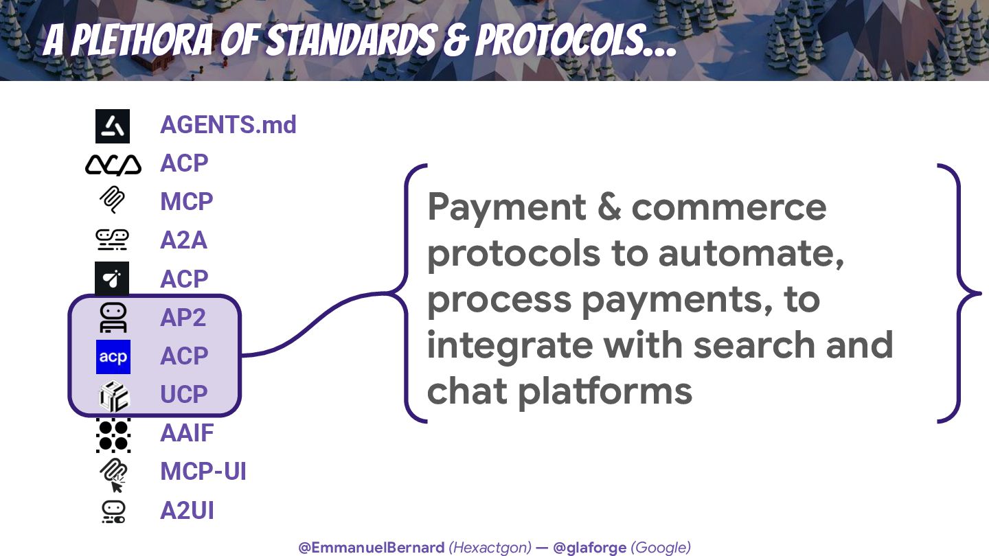 Protocols… AGENTS.md ACP MCP A2A ACP AP2 ACP UCP AAIF MCP-UI A2UI Payment & commerce protocols to automate, process payments, to integrate with search and chat platforms