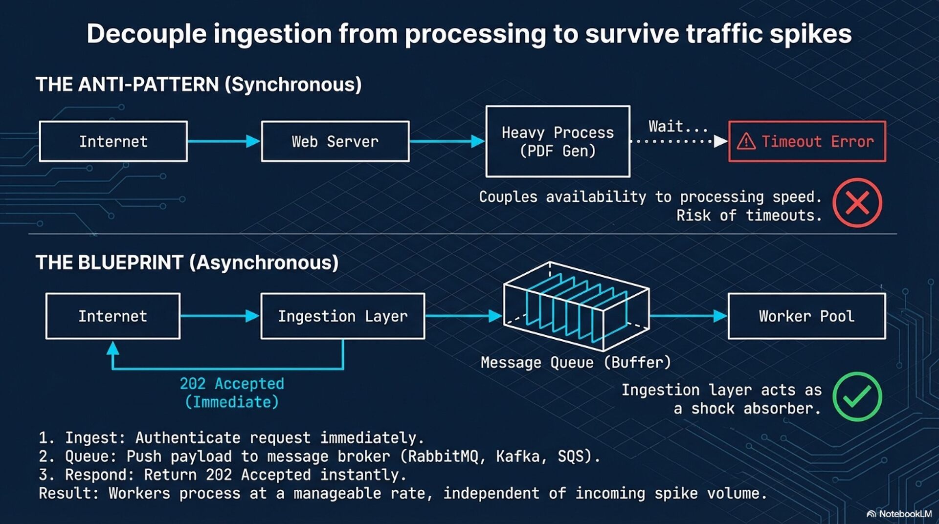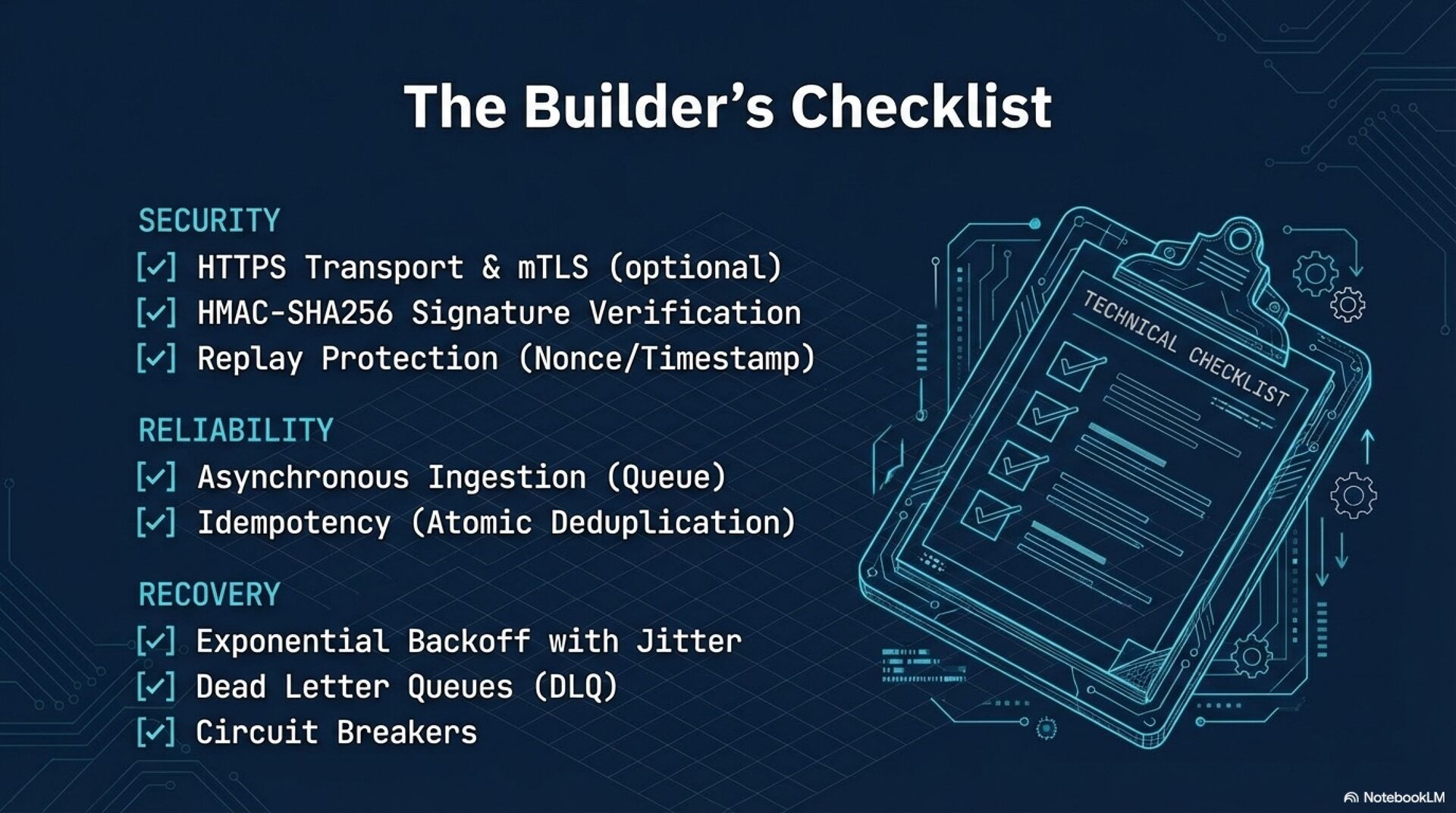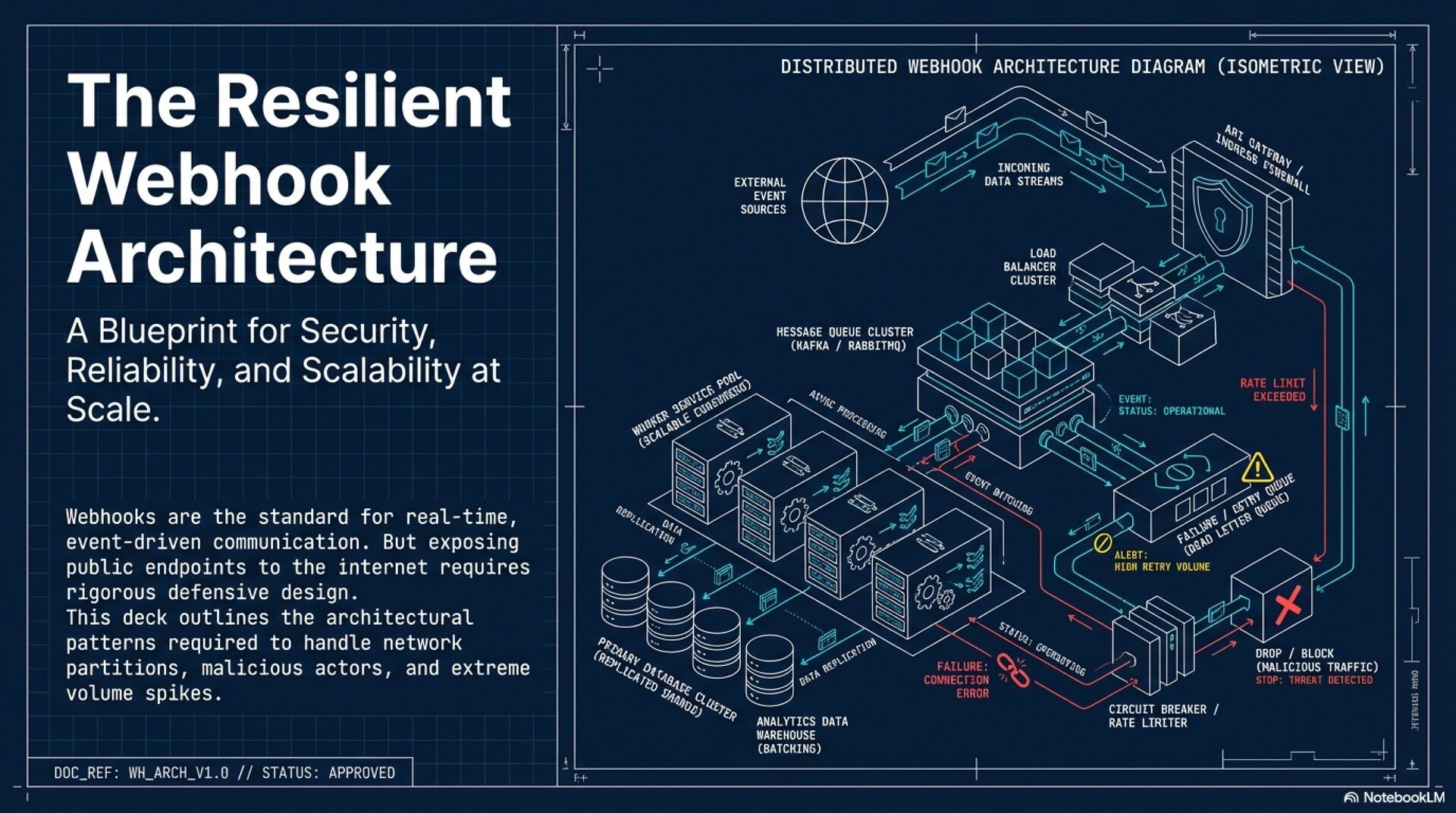 Webhooks facilitate real-time, event-driven communication between systems but require a defensive architecture to ensure security, reliability, and scalability. Unlike polling, webhooks utilize a "push" model, necessitating robust handling of network partitions, malicious activity, and traffic spikes.