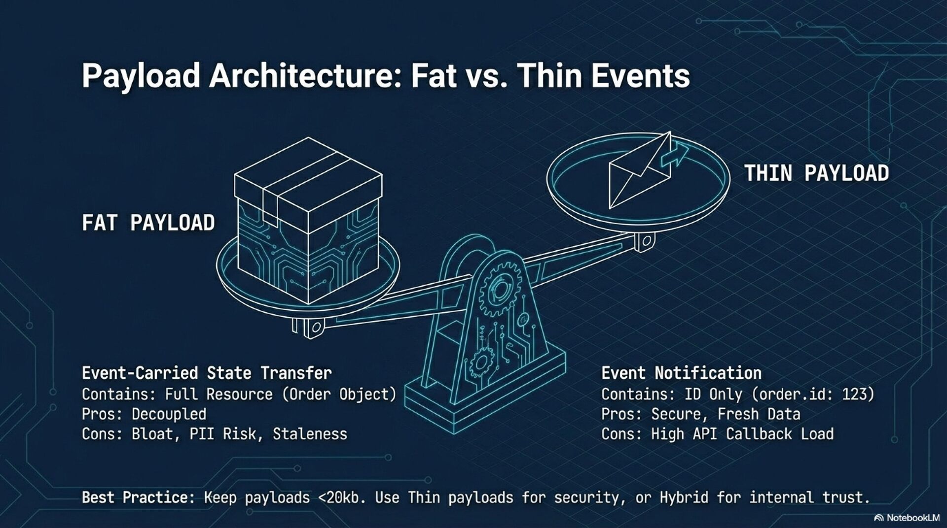 Scalability and Payload Design To manage bursty traffic, providers should enforce rate limiting and buffering. Payload design involves a trade-off between "Fat" payloads (full state, convenient but larger attack surface) and "Thin" payloads (notifications only, secure but require callback API calls). Best practices suggest keeping payloads under 20kb, minimizing PII, and utilizing additive versioning per event type to maintain backward compatibility.