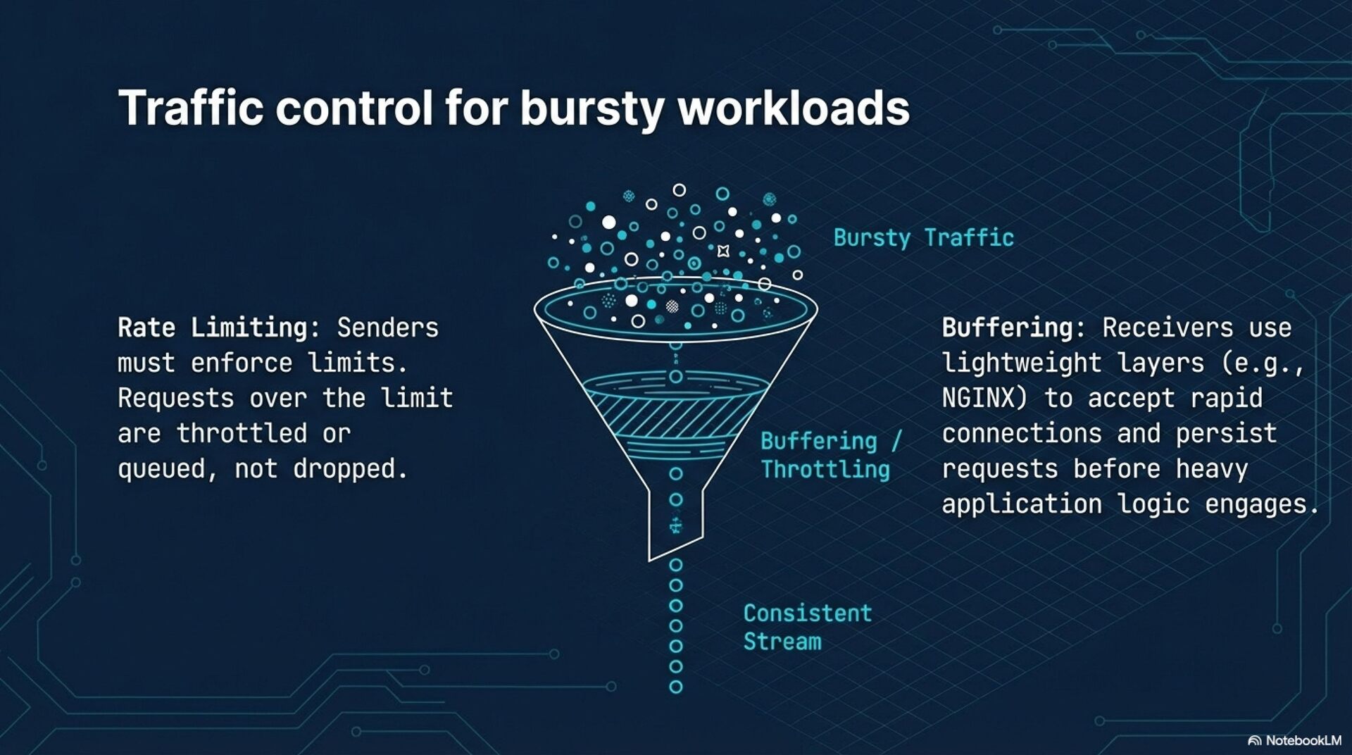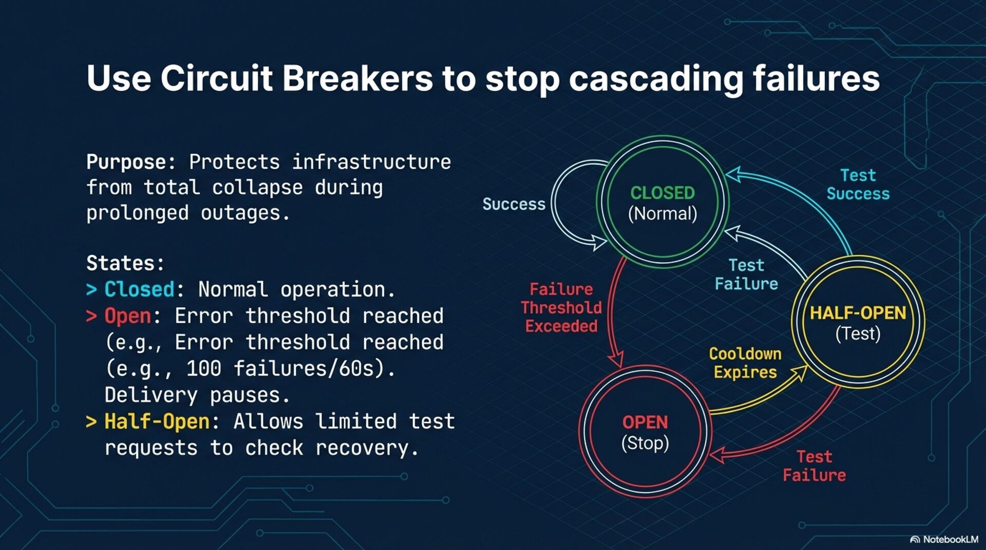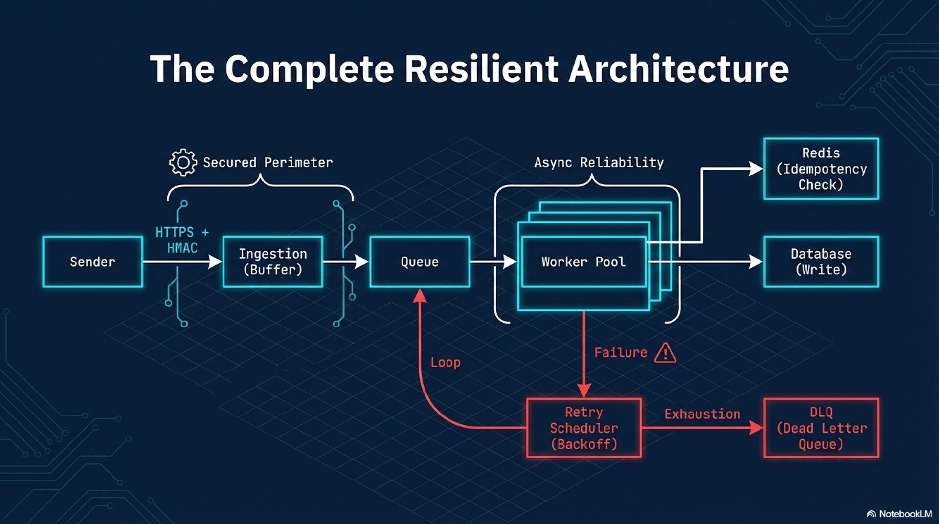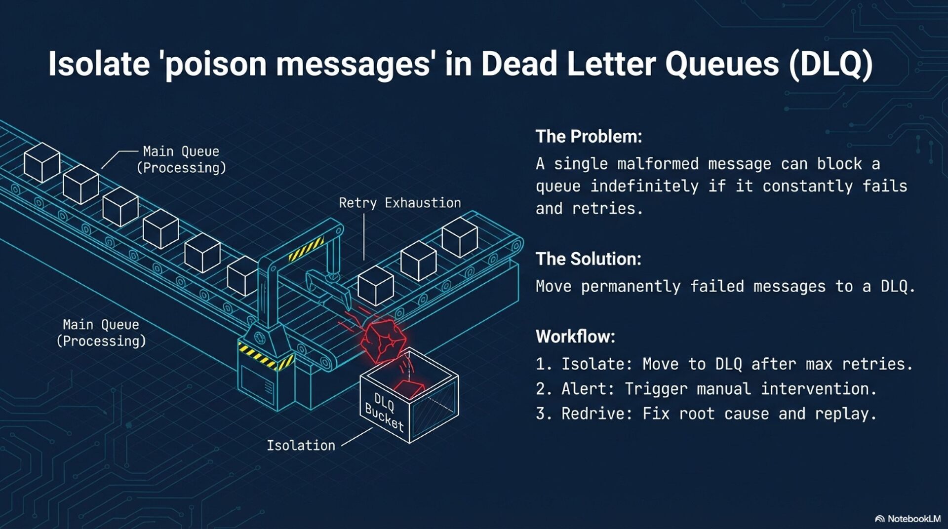 Failure Handling and Recovery Robust systems employ exponential backoff with jitter for retries to prevent "thundering herd" scenarios that could overwhelm the receiver. Messages that fail all retry attempts should be routed to a Dead Letter Queue (DLQ) for inspection and potential redrive rather than being discarded. Additionally, circuit breakers are essential to pause delivery to failing endpoints, protecting the infrastructure from cascading failures during outages.