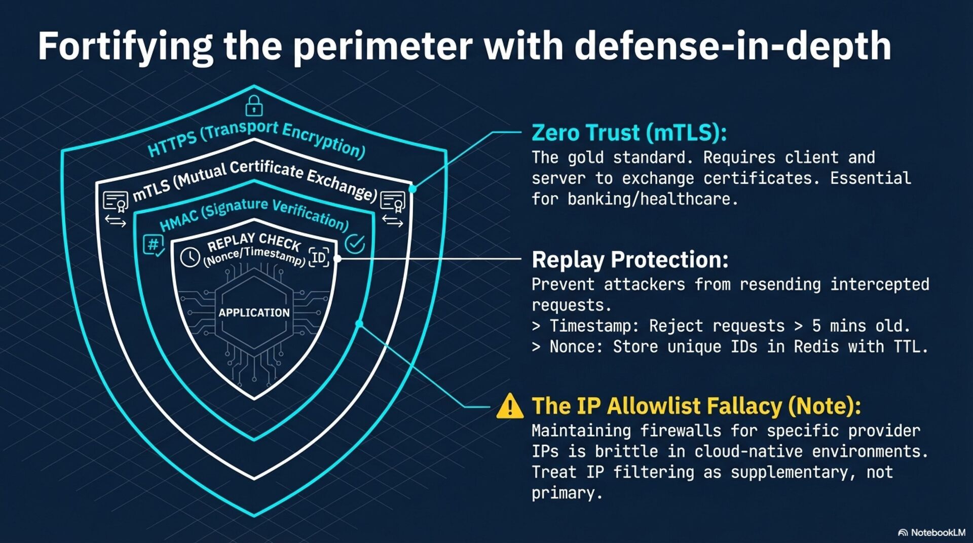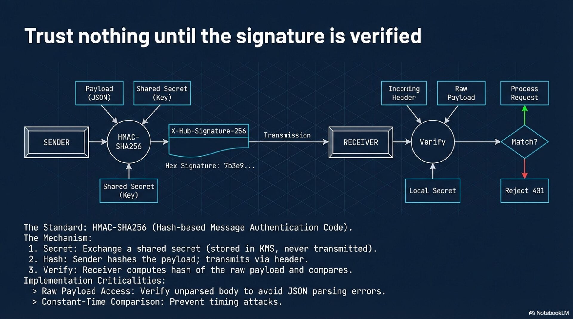 Security and Authentication Security implementation must go beyond obscured URLs. The industry standard involves HMAC-SHA256 signature verification to ensure payload integrity and authenticity. Critical implementation details include using constant-time string comparisons to prevent timing attacks and validating raw, unparsed payloads. To prevent replay attacks, systems should enforce timestamp tolerance windows and utilize nonces. While Mutual TLS (mTLS) offers a higher security standard for zero-trust environments, it introduces significant complexity compared to signatures and IP allowlisting.