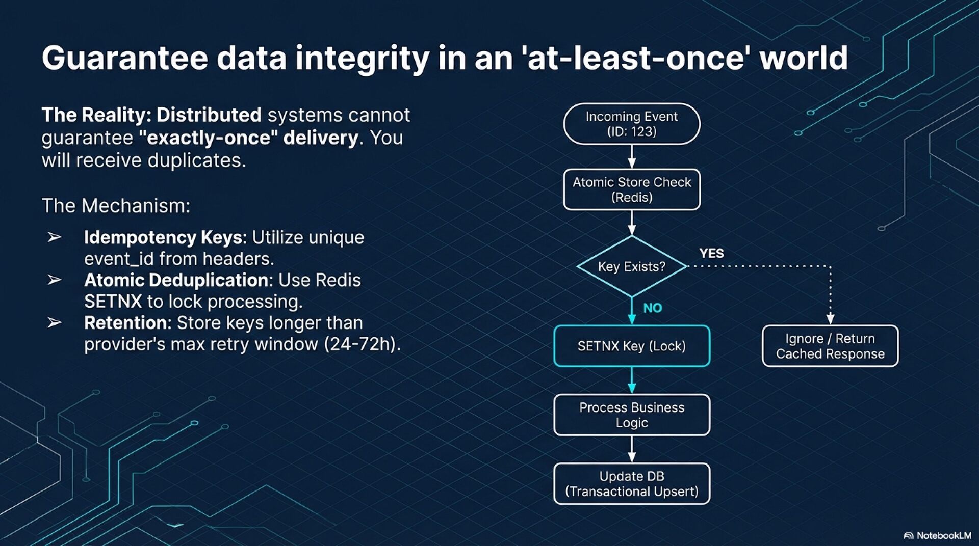Reliability and Architecture Because webhooks typically guarantee "at-least-once" delivery, receivers must implement idempotency using unique event keys and atomic storage to prevent duplicate processing from corrupting data. To handle high throughput and avoid timeouts, architectures should be asynchronous: an ingestion layer should immediately acknowledge requests (returning 202 Accepted) and offload the payload to a message queue for background processing by workers.