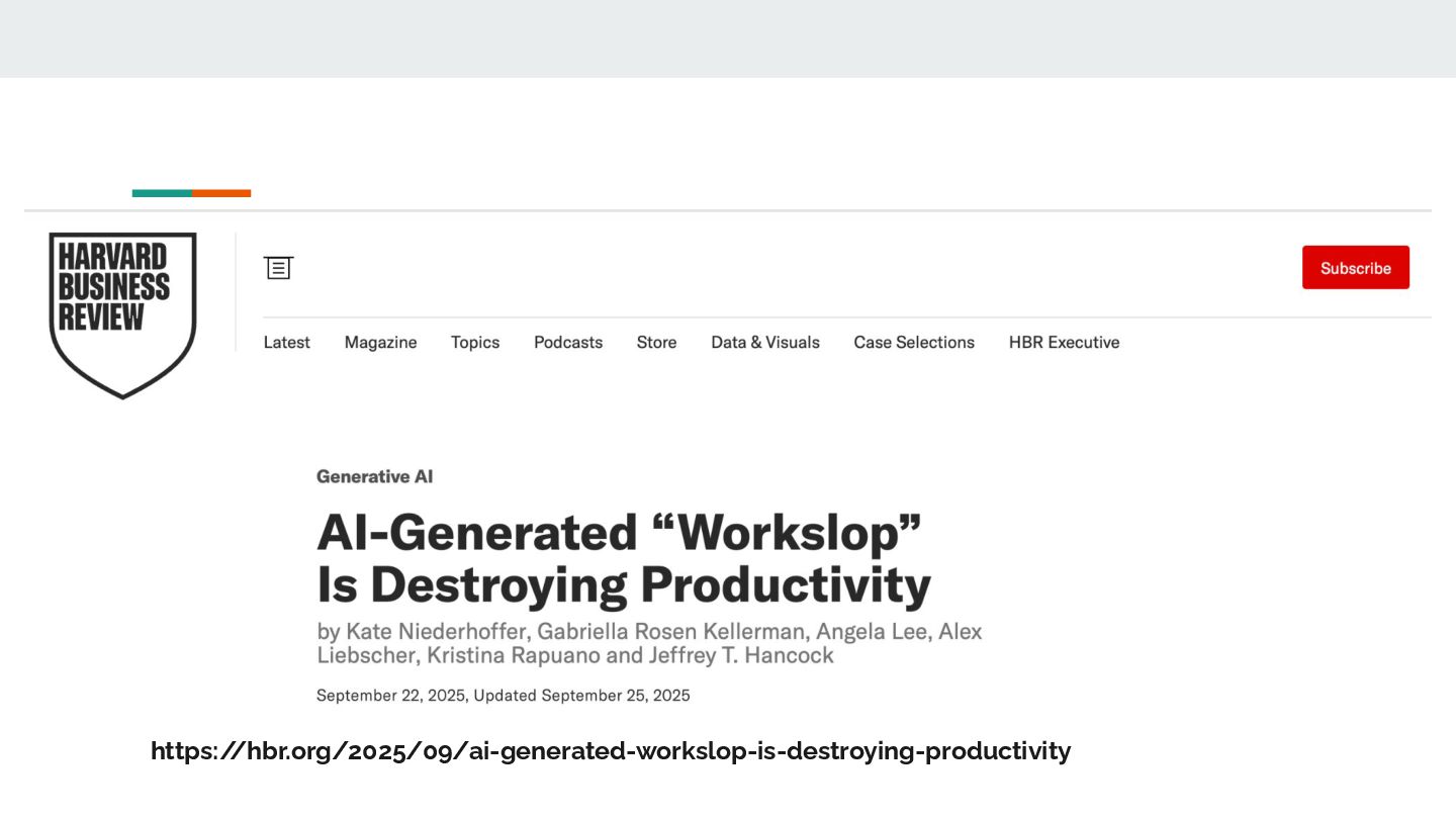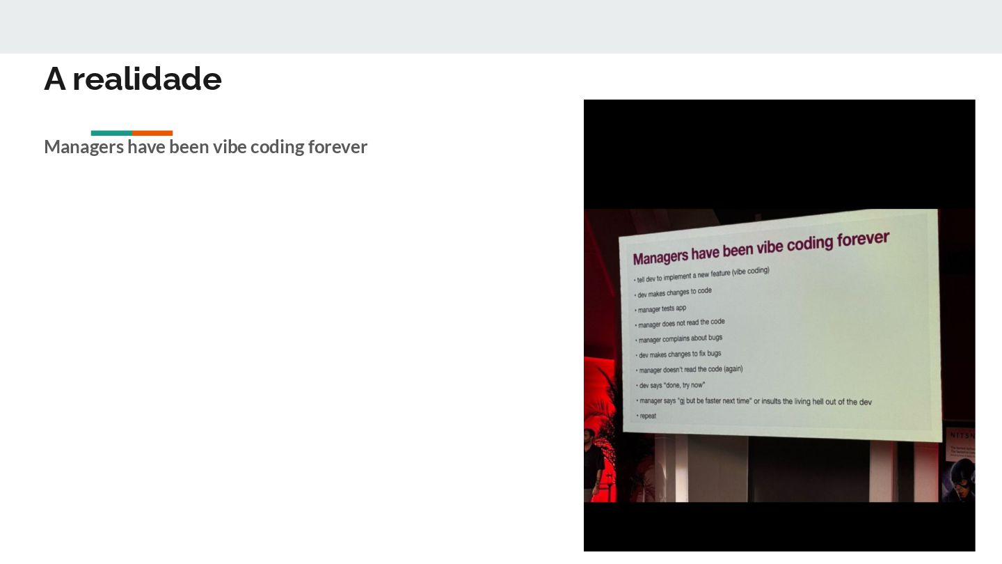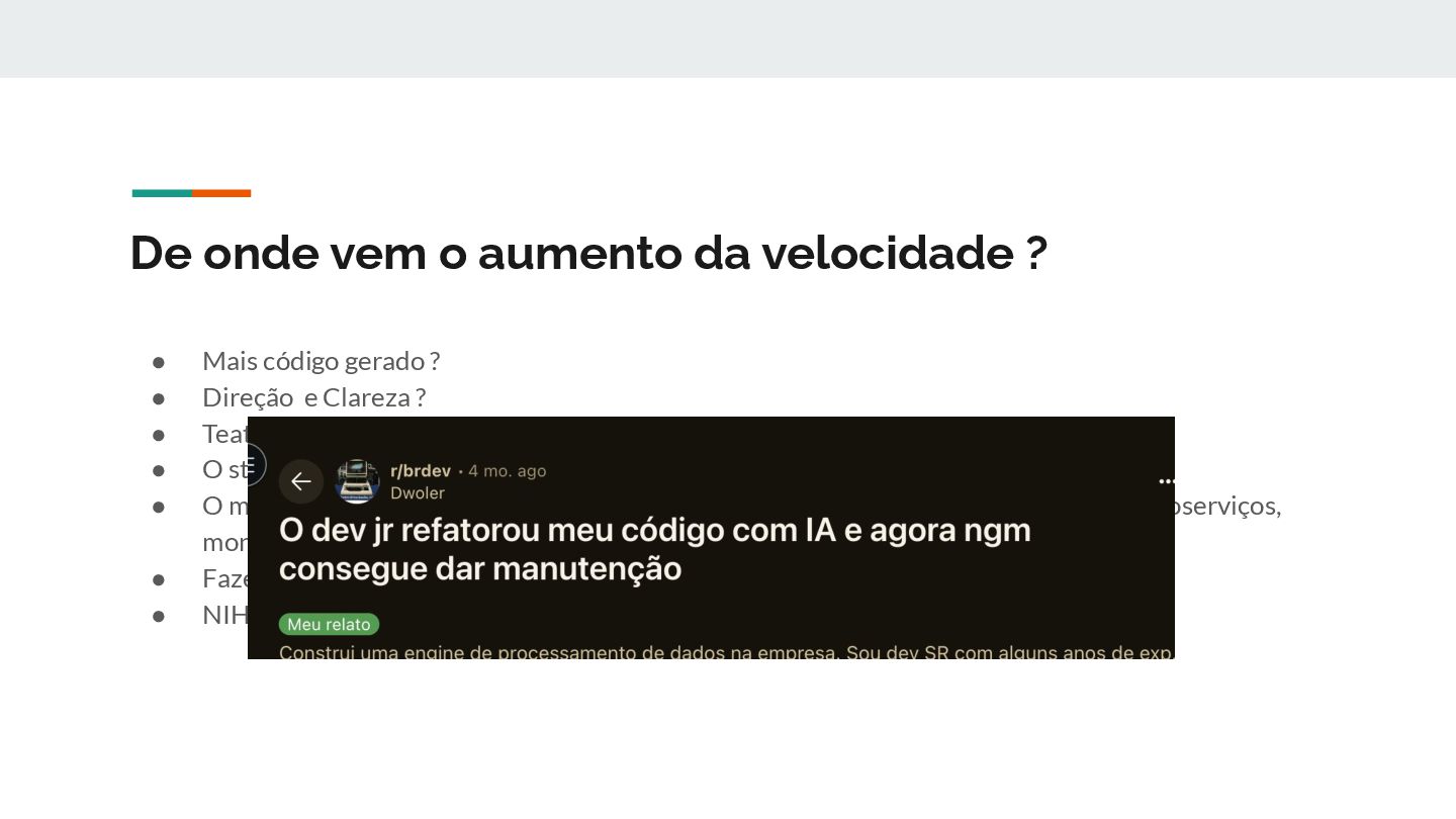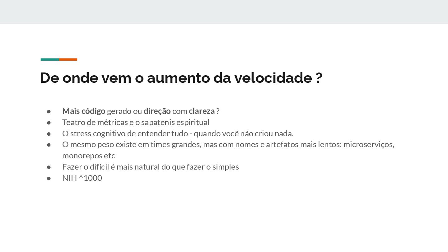 código gerado ou direção com clareza ? • Teatro de métricas e o sapatenis espiritual • O stress cognitivo de entender tudo - quando você não criou nada. • O mesmo peso existe em times grandes, mas com nomes e artefatos mais lentos: microserviços, monorepos etc • Fazer o difícil é mais natural do que fazer o simples • NIH ^1000