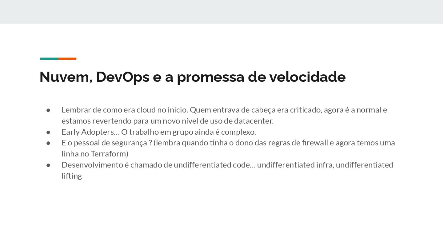 como era cloud no inicio. Quem entrava de cabeça era criticado, agora é a normal e estamos revertendo para um novo nível de uso de datacenter. • Early Adopters… O trabalho em grupo ainda é complexo. • E o pessoal de segurança ? (lembra quando tinha o dono das regras de firewall e agora temos uma linha no Terraform) • Desenvolvimento é chamado de undifferentiated code… undifferentiated infra, undifferentiated lifting