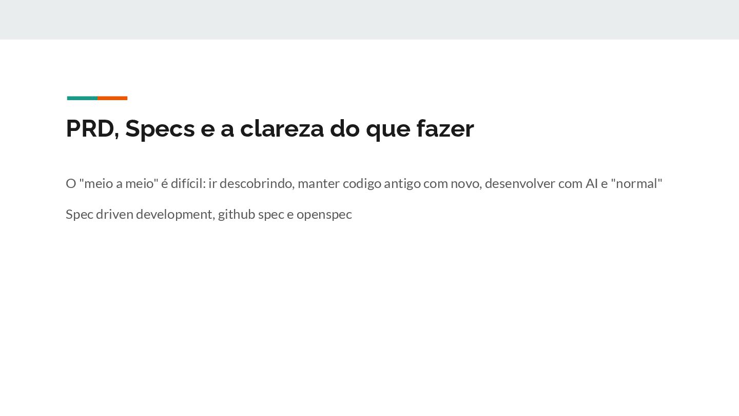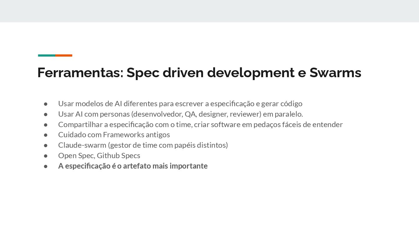 AI diferentes para escrever a especificação e gerar código • Usar AI com personas (desenvolvedor, QA, designer, reviewer) em paralelo. • Compartilhar a especificação com o time, criar software em pedaços fáceis de entender • Cuidado com Frameworks antigos • Claude-swarm (gestor de time com papéis distintos) • Open Spec, Github Specs • A especificação é o artefato mais importante