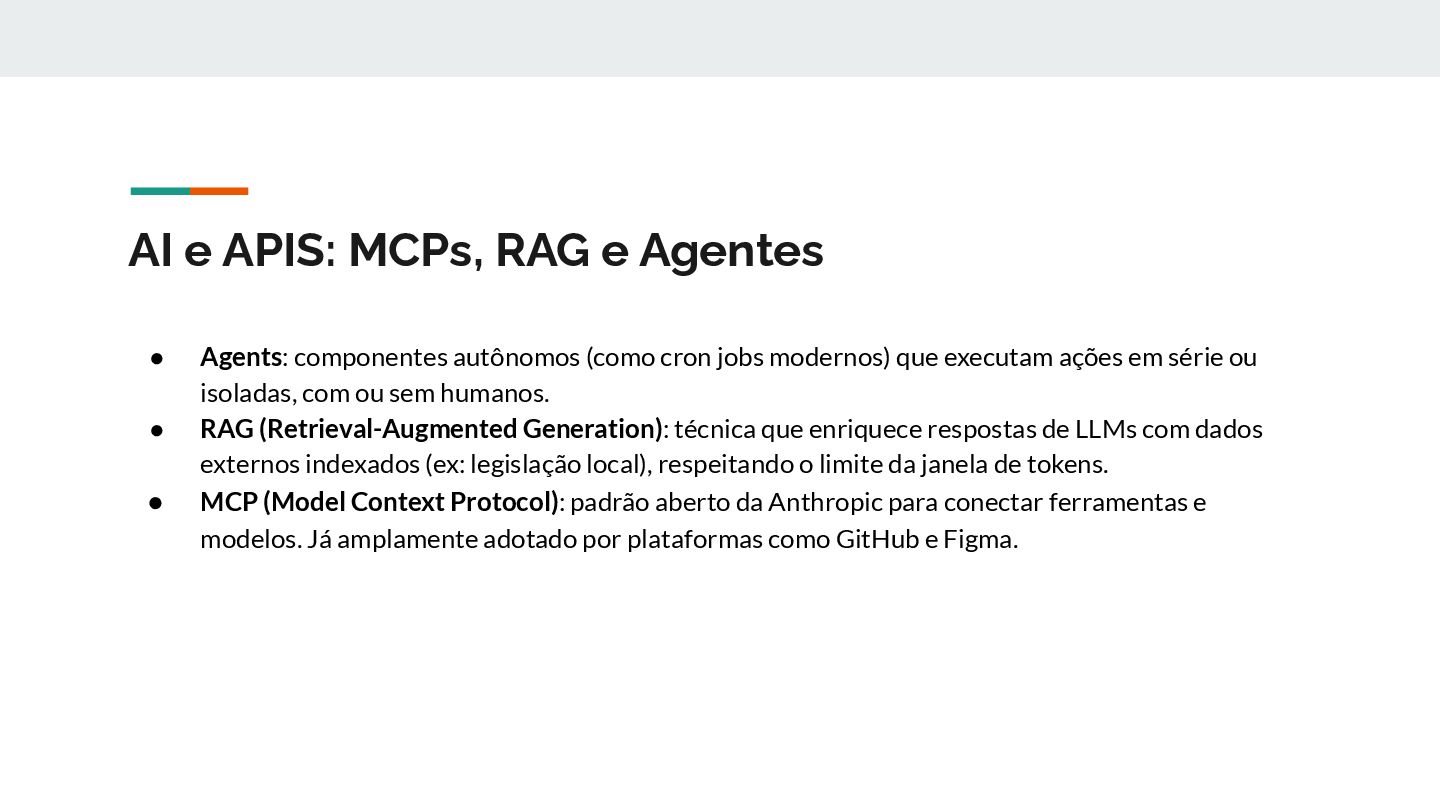 autônomos (como cron jobs modernos) que executam ações em série ou isoladas, com ou sem humanos. • RAG (Retrieval-Augmented Generation): técnica que enriquece respostas de LLMs com dados externos indexados (ex: legislação local), respeitando o limite da janela de tokens. • MCP (Model Context Protocol): padrão aberto da Anthropic para conectar ferramentas e modelos. Já amplamente adotado por plataformas como GitHub e Figma.