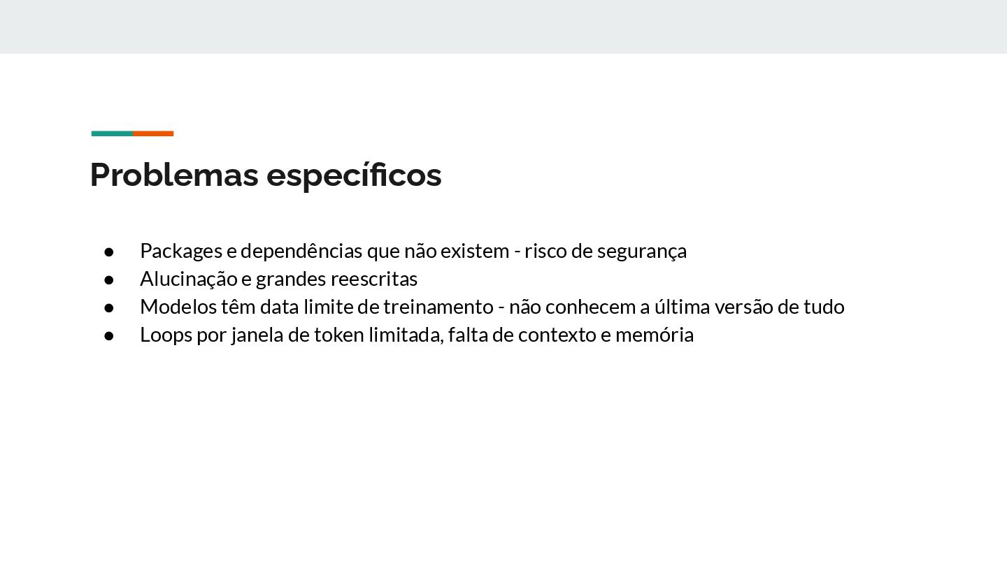 risco de segurança • Alucinação e grandes reescritas • Modelos têm data limite de treinamento - não conhecem a última versão de tudo • Loops por janela de token limitada, falta de contexto e memória