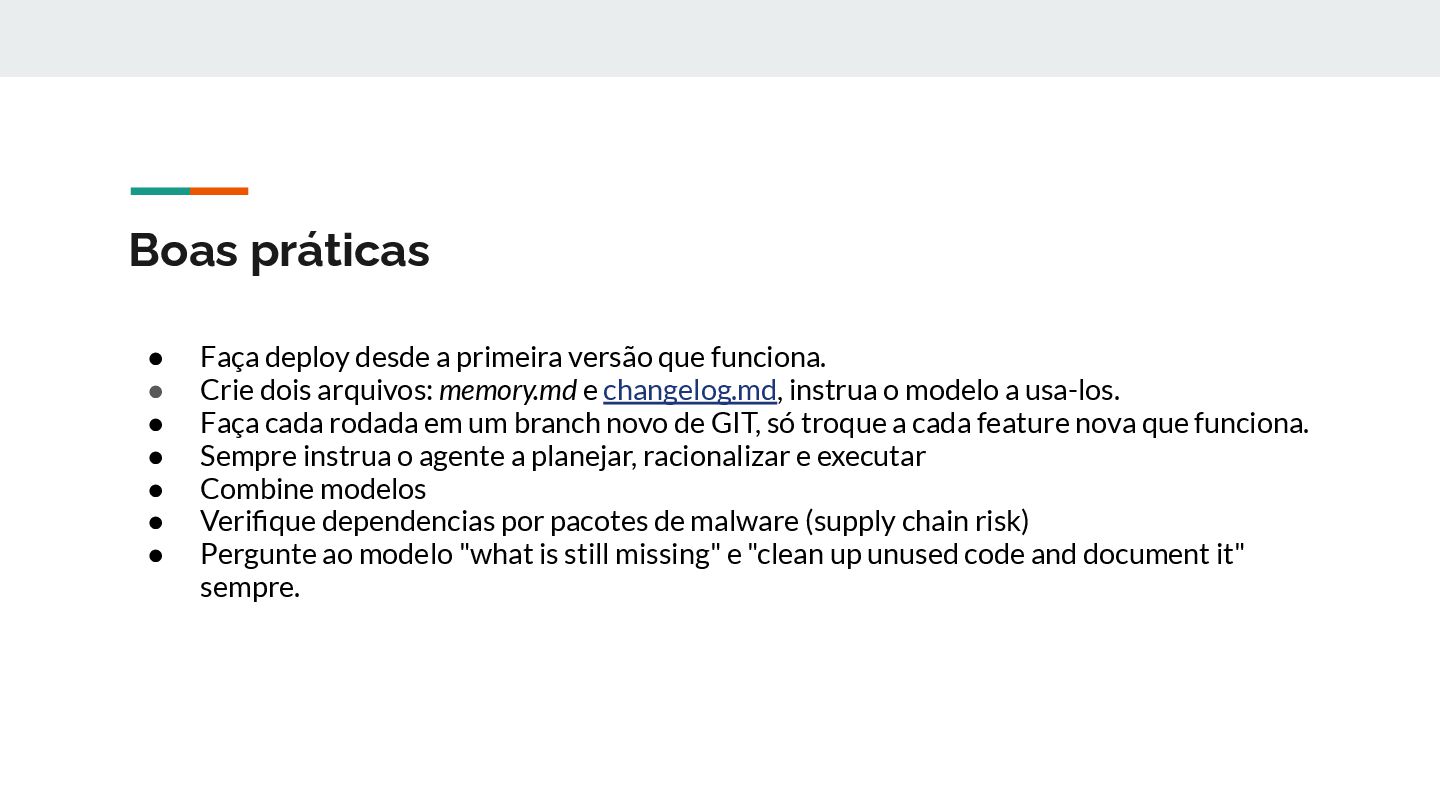 funciona. • Crie dois arquivos: memory.md e changelog.md, instrua o modelo a usa-los. • Faça cada rodada em um branch novo de GIT, só troque a cada feature nova que funciona. • Sempre instrua o agente a planejar, racionalizar e executar • Combine modelos • Verifique dependencias por pacotes de malware (supply chain risk) • Pergunte ao modelo "what is still missing" e "clean up unused code and document it" sempre.