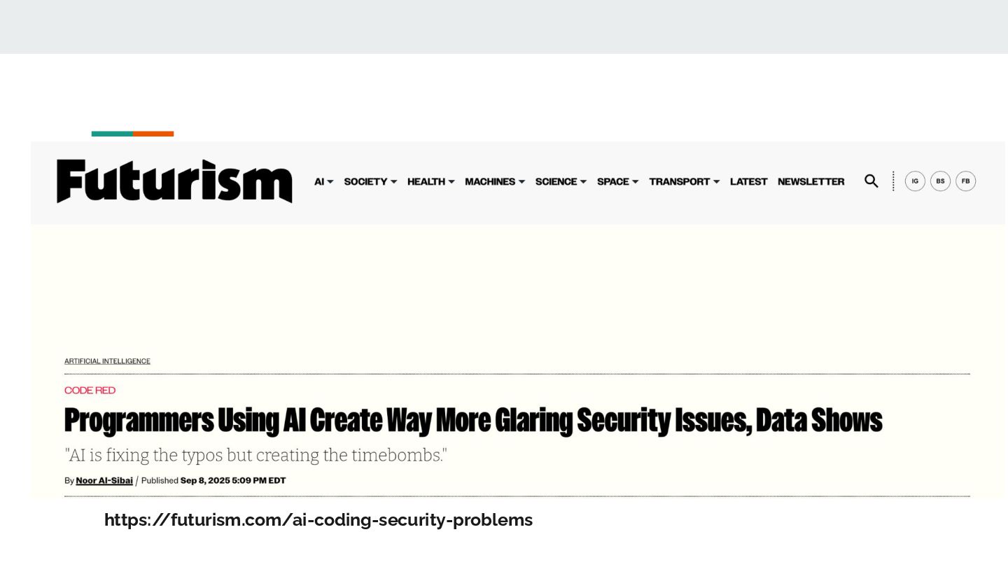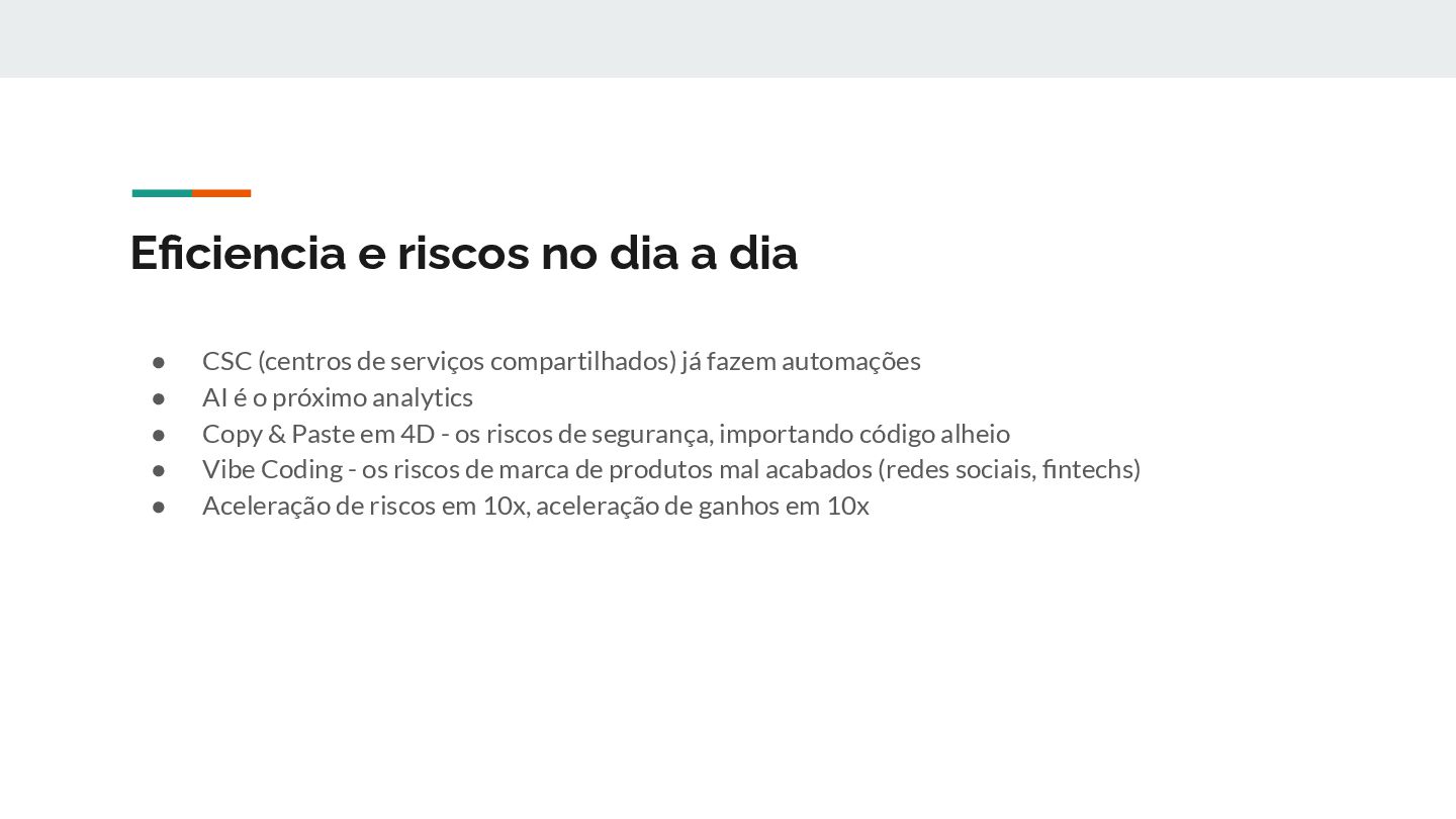 de serviços compartilhados) já fazem automações • AI é o próximo analytics • Copy & Paste em 4D - os riscos de segurança, importando código alheio • Vibe Coding - os riscos de marca de produtos mal acabados (redes sociais, fintechs) • Aceleração de riscos em 10x, aceleração de ganhos em 10x