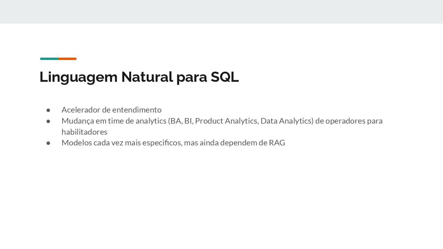 em time de analytics (BA, BI, Product Analytics, Data Analytics) de operadores para habilitadores • Modelos cada vez mais especificos, mas ainda dependem de RAG