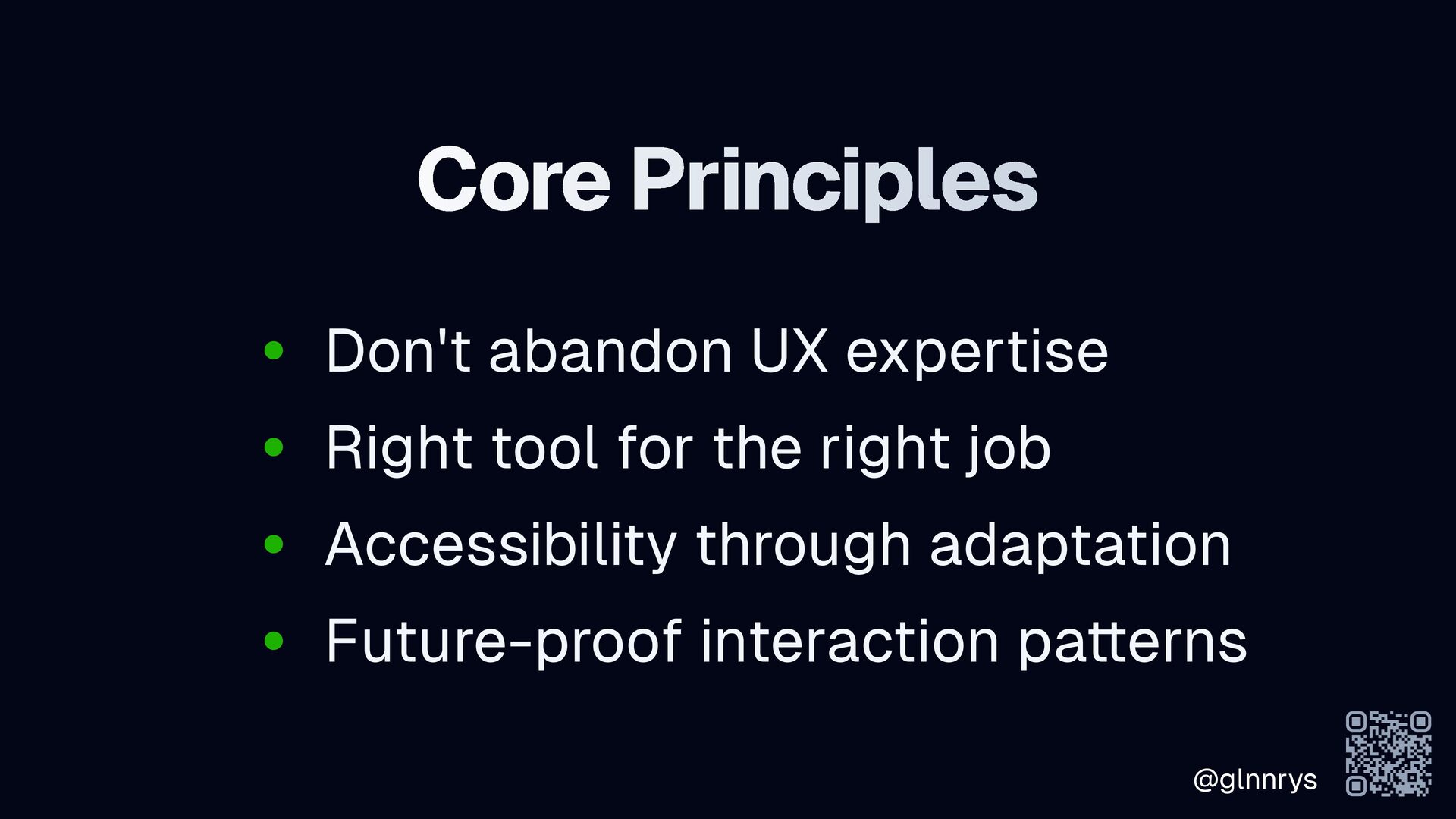 @glnnrys Core Principles • Don't abandon UX expertise • Right