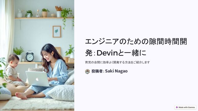 エンジニアのための隙間時間開 発:Devinと一緒に 育児の合間に効率よく開発する方法をご紹介します 投稿者:Saki Nagao