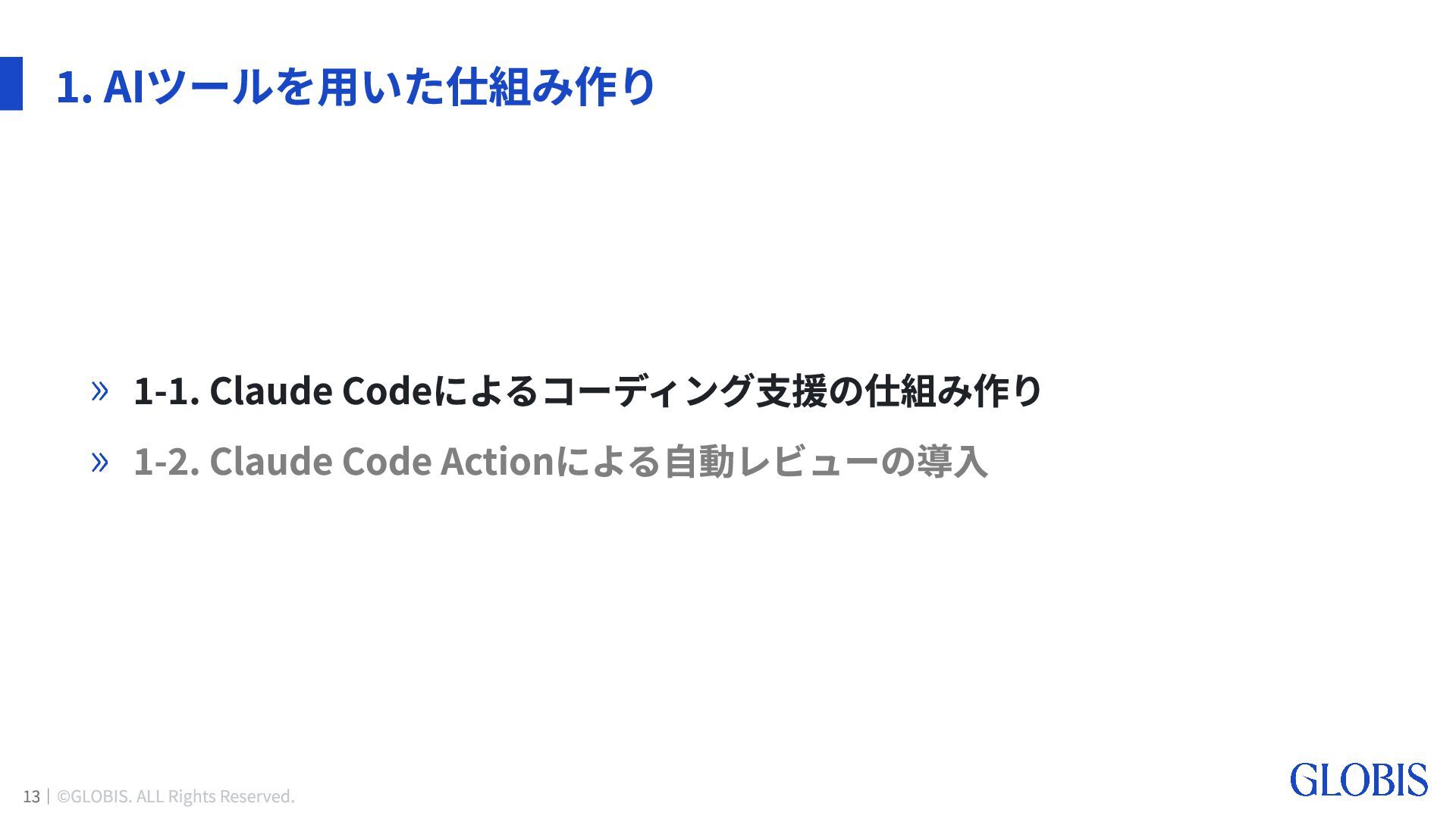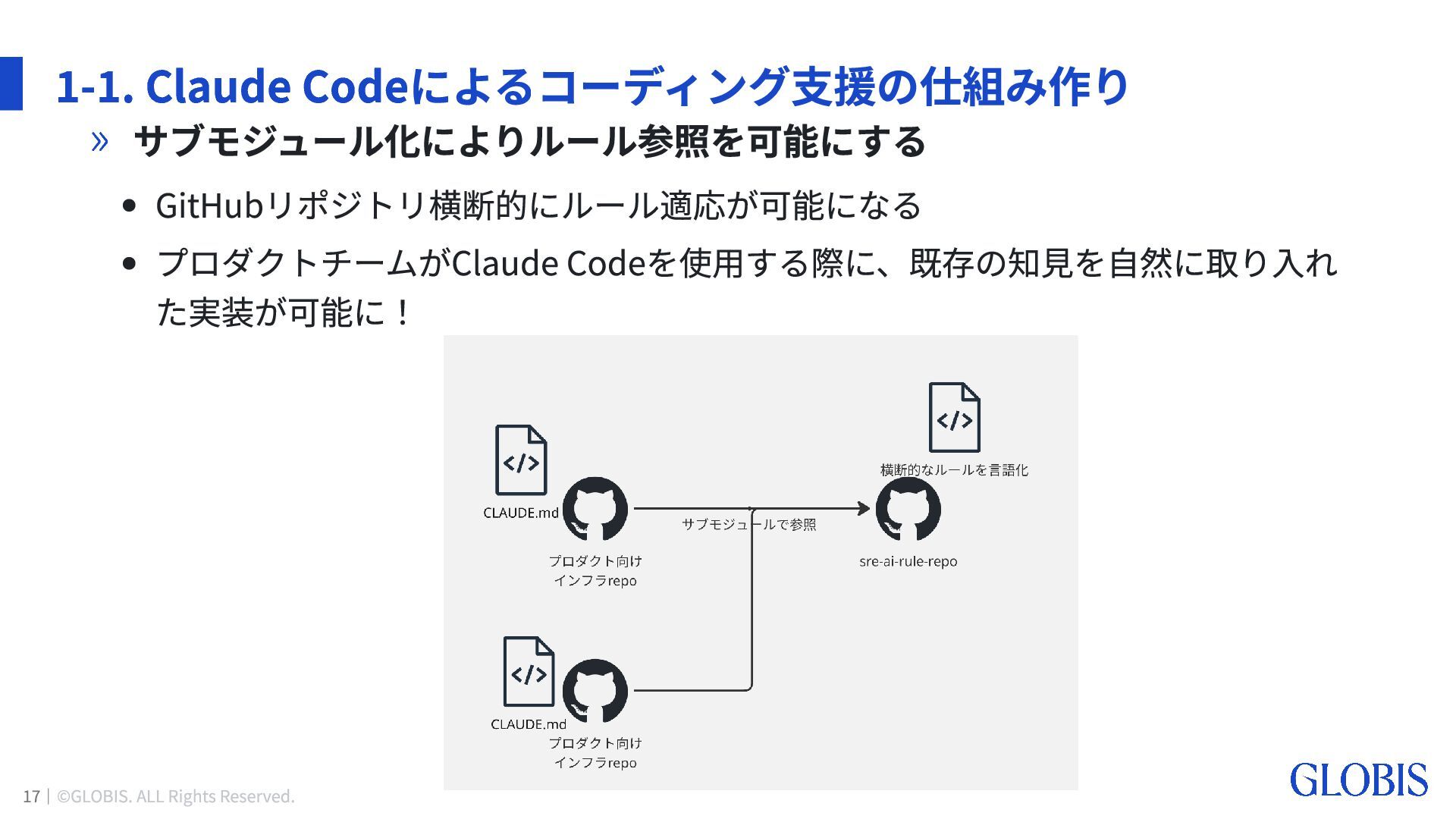 GitHubリポジトリ横断的にルール適応が可能になる プロダクトチームがClaude Codeを使用する際に、既存の知見を自然に取り入れ た実装が可能に! 1-1. Claude Codeによるコーディング支援の仕組み作り サブモジュール化によりルール参照を可能にする » ©GLOBIS.