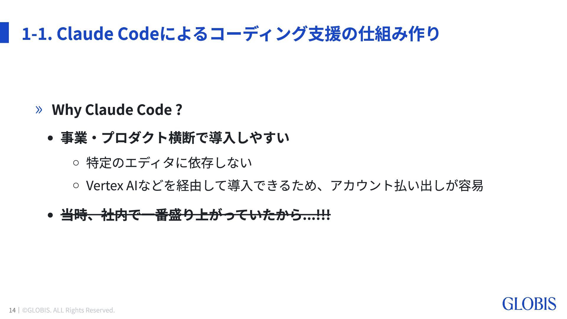 事業・プロダクト横断で導入しやすい 特定のエディタに依存しない Vertex AIなどを経由して導入できるため、アカウント払い出しが容易 当時、社内で一番盛り上がっていたから...!!! 1-1. Claude Codeによるコーディング支援の仕組み作り Why Claude