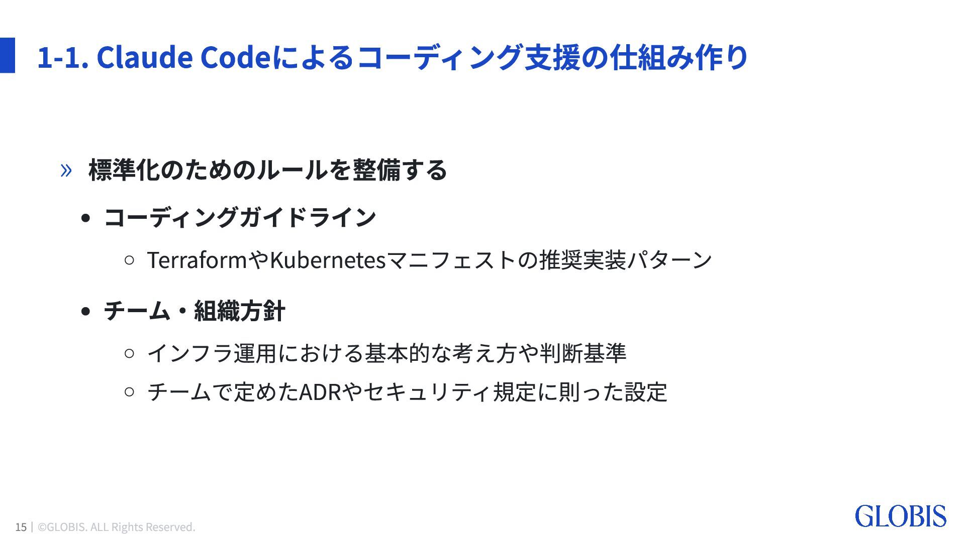 コーディングガイドライン TerraformやKubernetesマニフェストの推奨実装パターン チーム・組織方針 インフラ運用における基本的な考え方や判断基準 チームで定めたADRやセキュリティ規定に則った設定 1-1. Claude Codeによるコーディング支援の仕組み作り 標準化のためのルールを整備する »