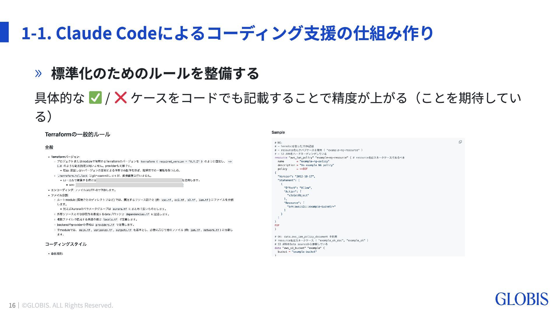 具体的な / ケースをコードでも記載することで精度が上がる(ことを期待してい る) 1-1. Claude Codeによるコーディング支援の仕組み作り 標準化のためのルールを整備する » ©GLOBIS.