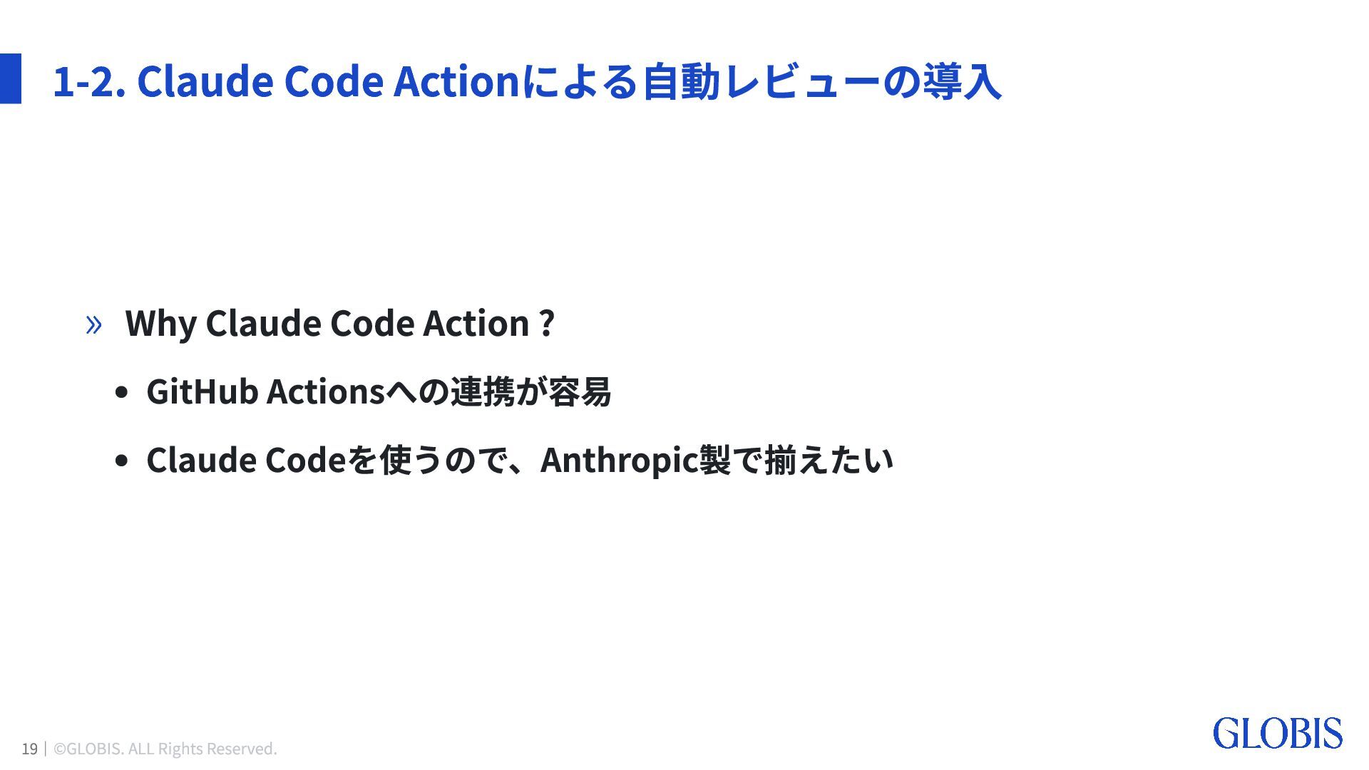 GitHub Actionsへの連携が容易 Claude Codeを使うので、Anthropic製で揃えたい 1-2. Claude Code Actionによる自動レビューの導入 Why Claude