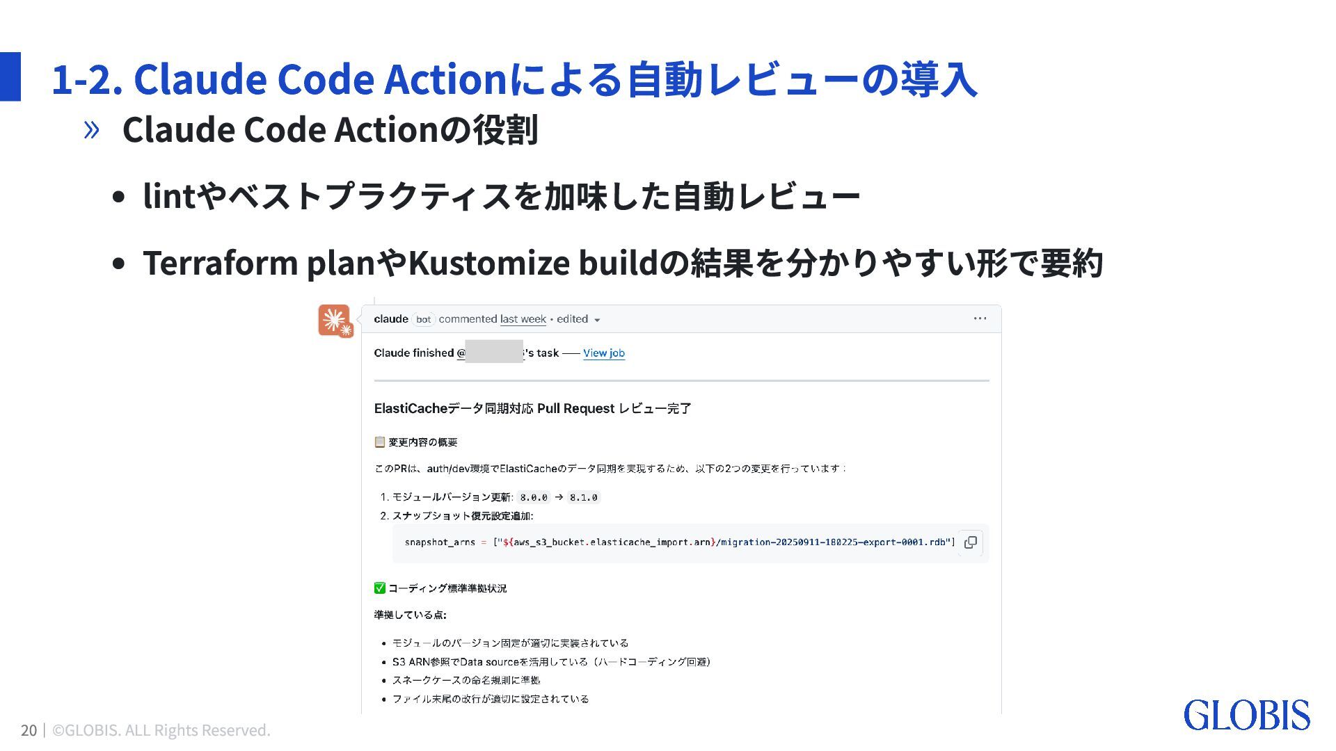 lintやベストプラクティスを加味した自動レビュー Terraform planやKustomize buildの結果を分かりやすい形で要約 1-2. Claude Code Actionによる自動レビューの導入 Claude Code