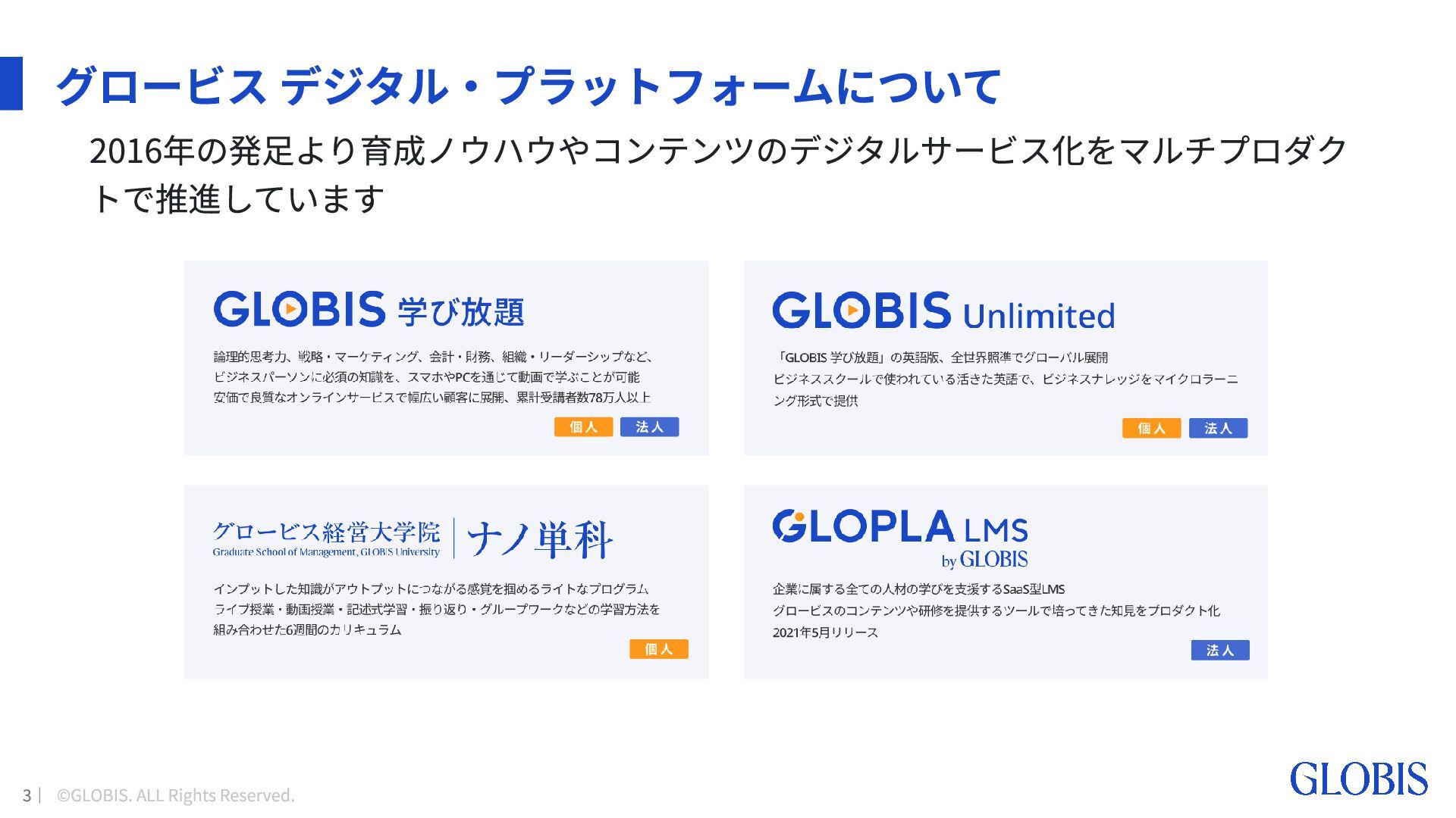 2016年の発足より育成ノウハウやコンテンツのデジタルサービス化をマルチプロダク トで推進しています グロービス デジタル・プラットフォームについて ©GLOBIS. ALL Rights Reserved. 3│