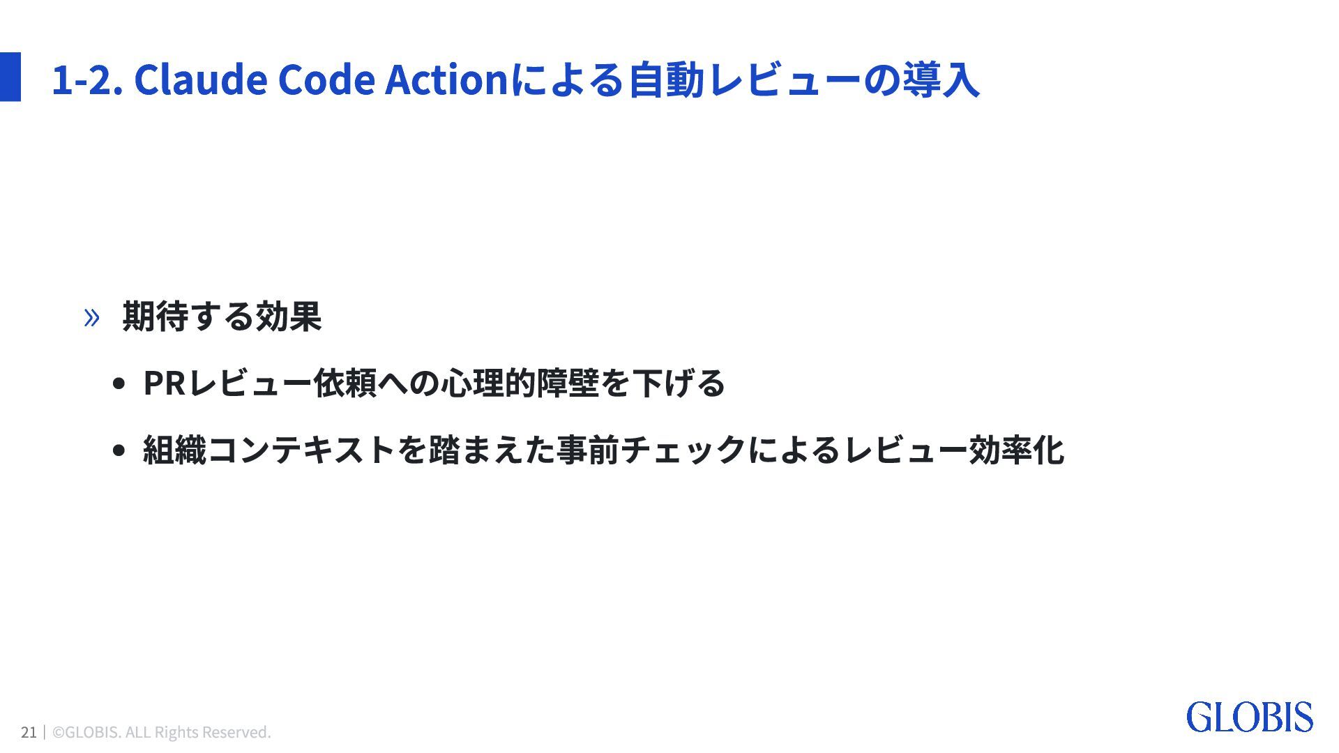 PRレビュー依頼への心理的障壁を下げる 組織コンテキストを踏まえた事前チェックによるレビュー効率化 1-2. Claude Code Actionによる自動レビューの導入 期待する効果 » ©GLOBIS. ALL