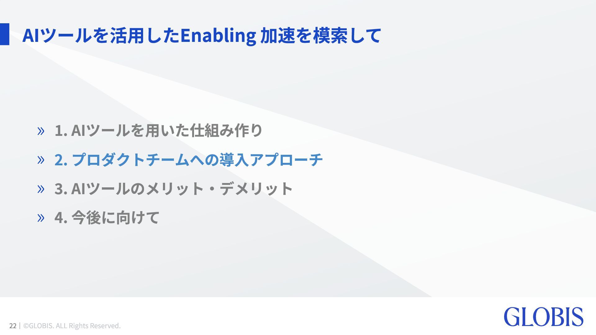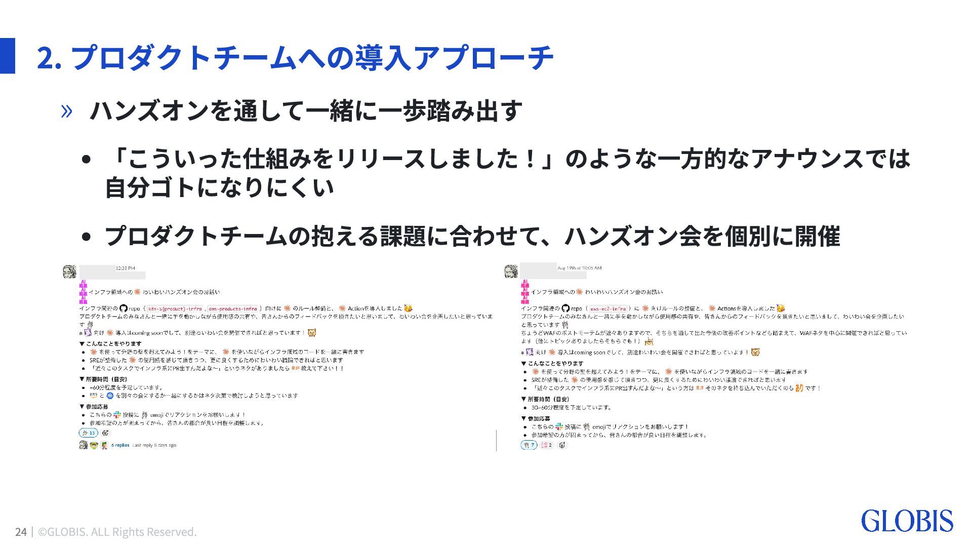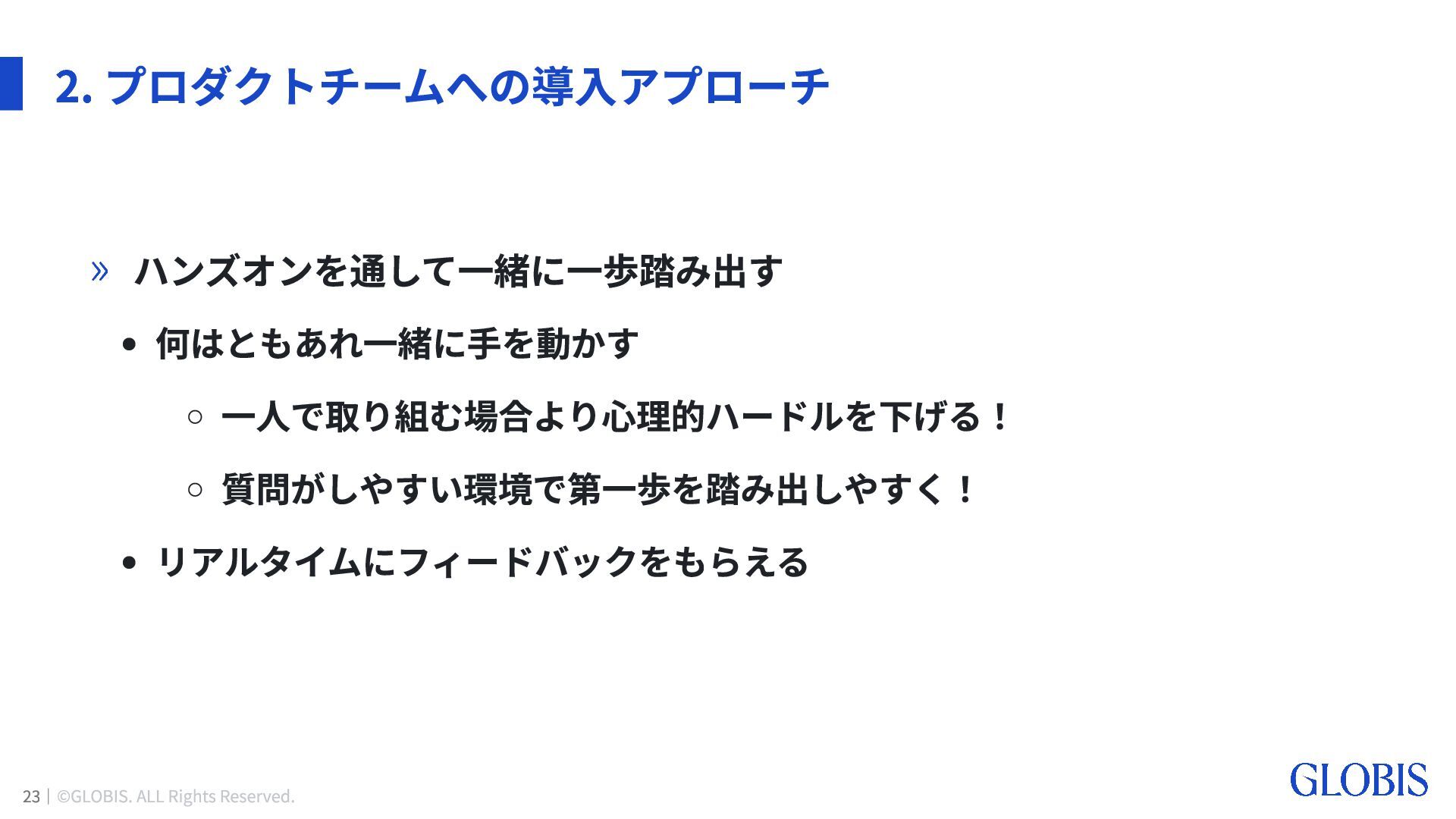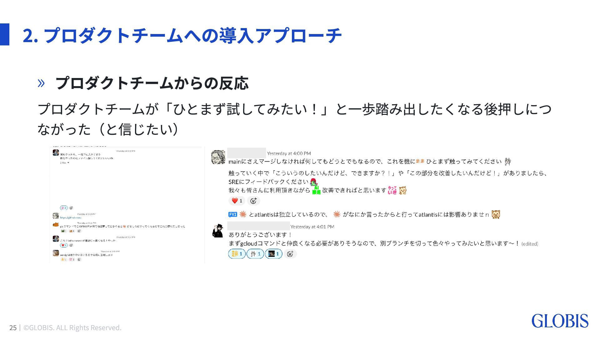 プロダクトチームが「ひとまず試してみたい!」と一歩踏み出したくなる後押しにつ ながった(と信じたい) 2. プロダクトチームへの導入アプローチ プロダクトチームからの反応 » ©GLOBIS. ALL Rights Reserved.