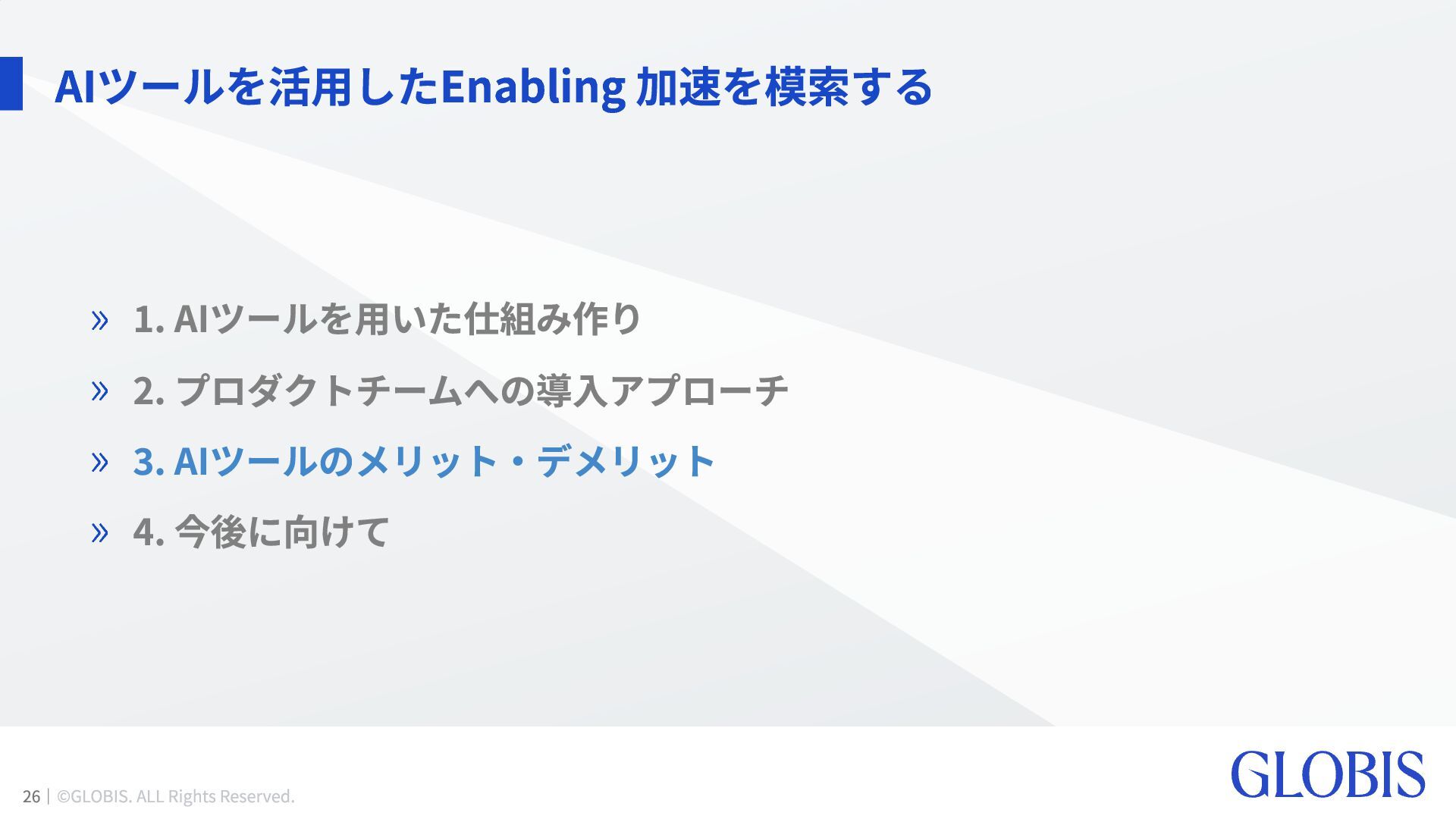AIツールを活用したEnabling 加速を模索する 1. AIツールを用いた仕組み作り » 2. プロダクトチームへの導入アプローチ » 3. AIツールのメリット・デメリット