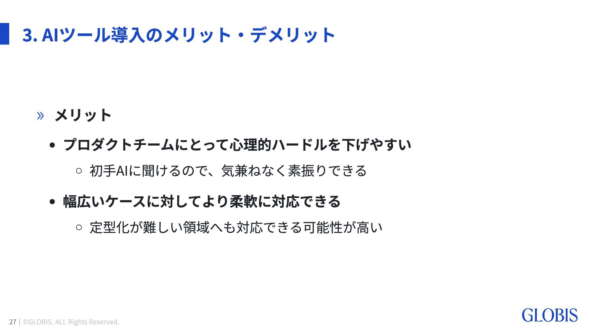 プロダクトチームにとって心理的ハードルを下げやすい 初手AIに聞けるので、気兼ねなく素振りできる 幅広いケースに対してより柔軟に対応できる 定型化が難しい領域へも対応できる可能性が高い 3. AIツール導入のメリット・デメリット メリット » ©GLOBIS. ALL
