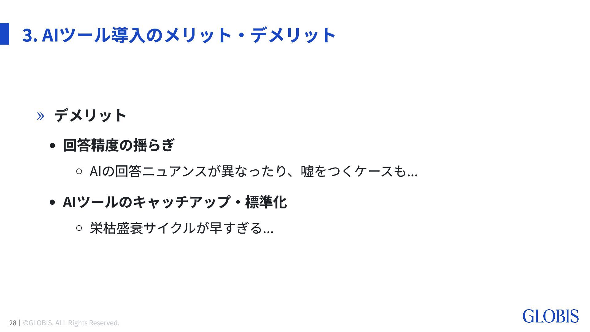 回答精度の揺らぎ AIの回答ニュアンスが異なったり、嘘をつくケースも... AIツールのキャッチアップ・標準化 栄枯盛衰サイクルが早すぎる... 3. AIツール導入のメリット・デメリット デメリット » ©GLOBIS. ALL