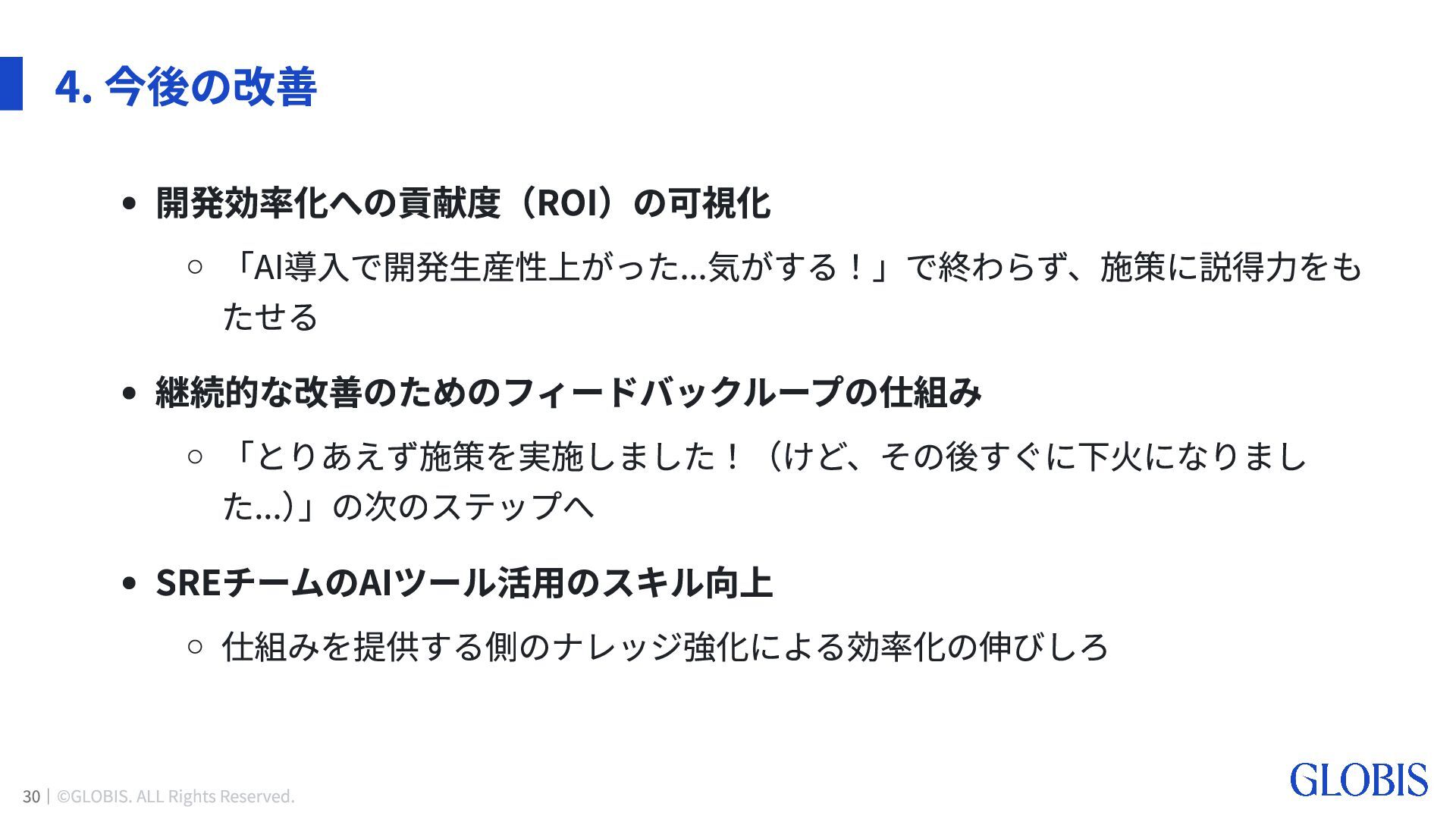 開発効率化への貢献度(ROI)の可視化 「AI導入で開発生産性上がった...気がする!」で終わらず、施策に説得力をも たせる 継続的な改善のためのフィードバックループの仕組み 「とりあえず施策を実施しました!(けど、その後すぐに下火になりまし た...) 」の次のステップへ SREチームのAIツール活用のスキル向上 仕組みを提供する側のナレッジ強化による効率化の伸びしろ 4.