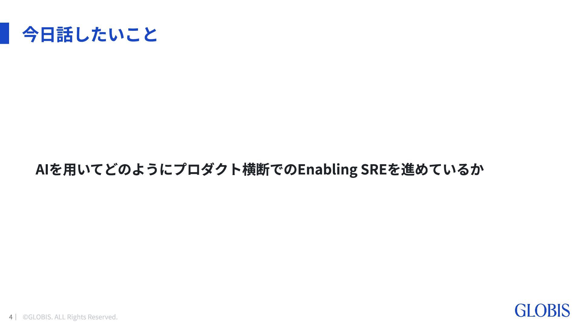AIを用いてどのようにプロダクト横断でのEnabling SREを進めているか 今日話したいこと ©GLOBIS. ALL Rights Reserved. 4│