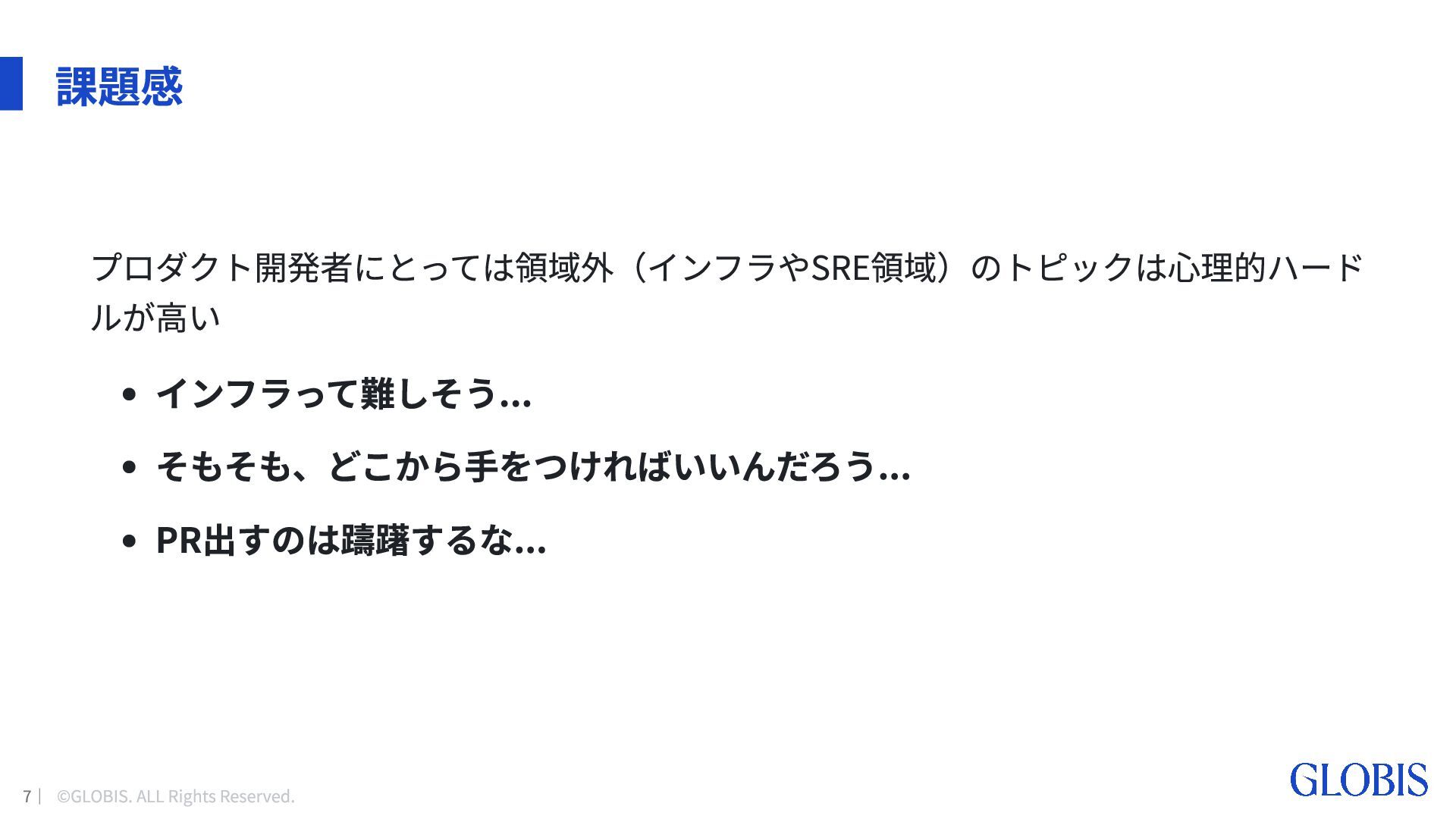 プロダクト開発者にとっては領域外(インフラやSRE領域)のトピックは心理的ハード ルが高い インフラって難しそう... そもそも、どこから手をつければいいんだろう... PR出すのは躊躇するな... 課題感 ©GLOBIS. ALL Rights Reserved.