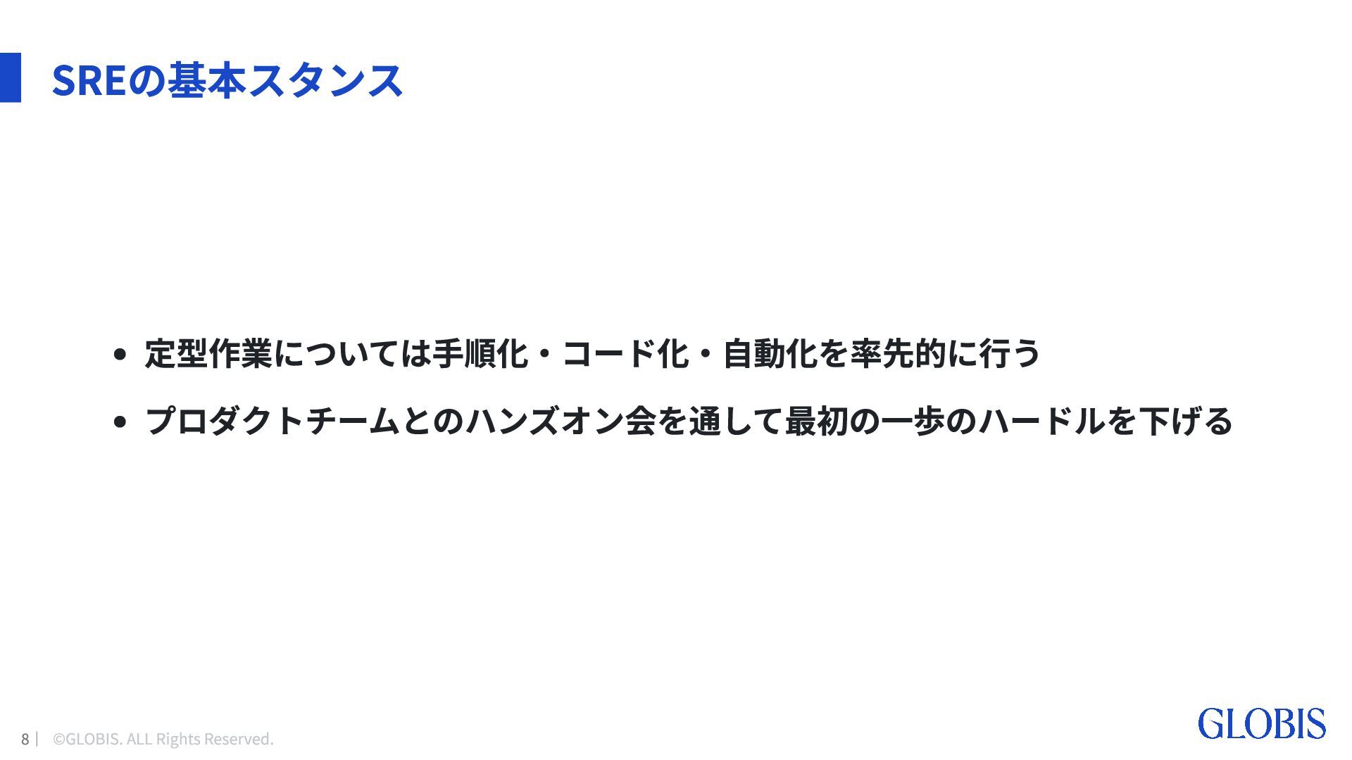 定型作業については手順化・コード化・自動化を率先的に行う プロダクトチームとのハンズオン会を通して最初の一歩のハードルを下げる SREの基本スタンス ©GLOBIS. ALL Rights Reserved. 8│