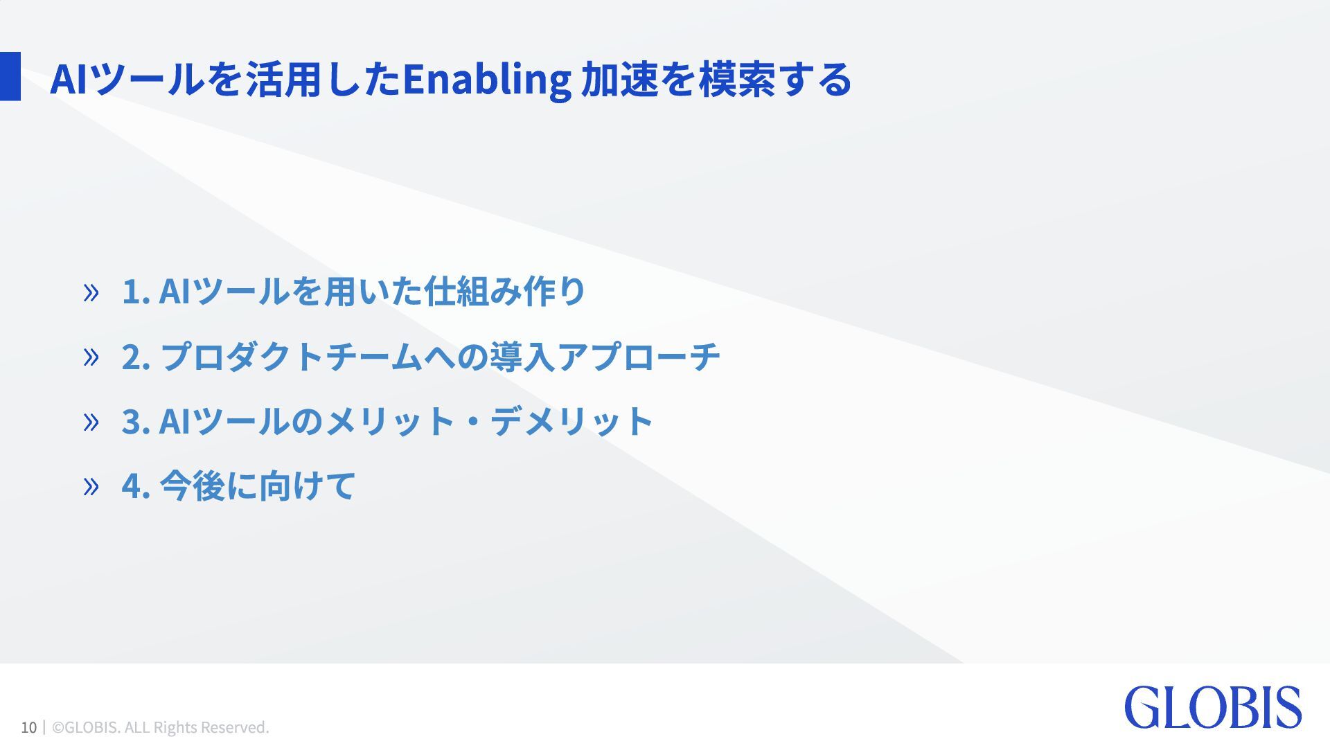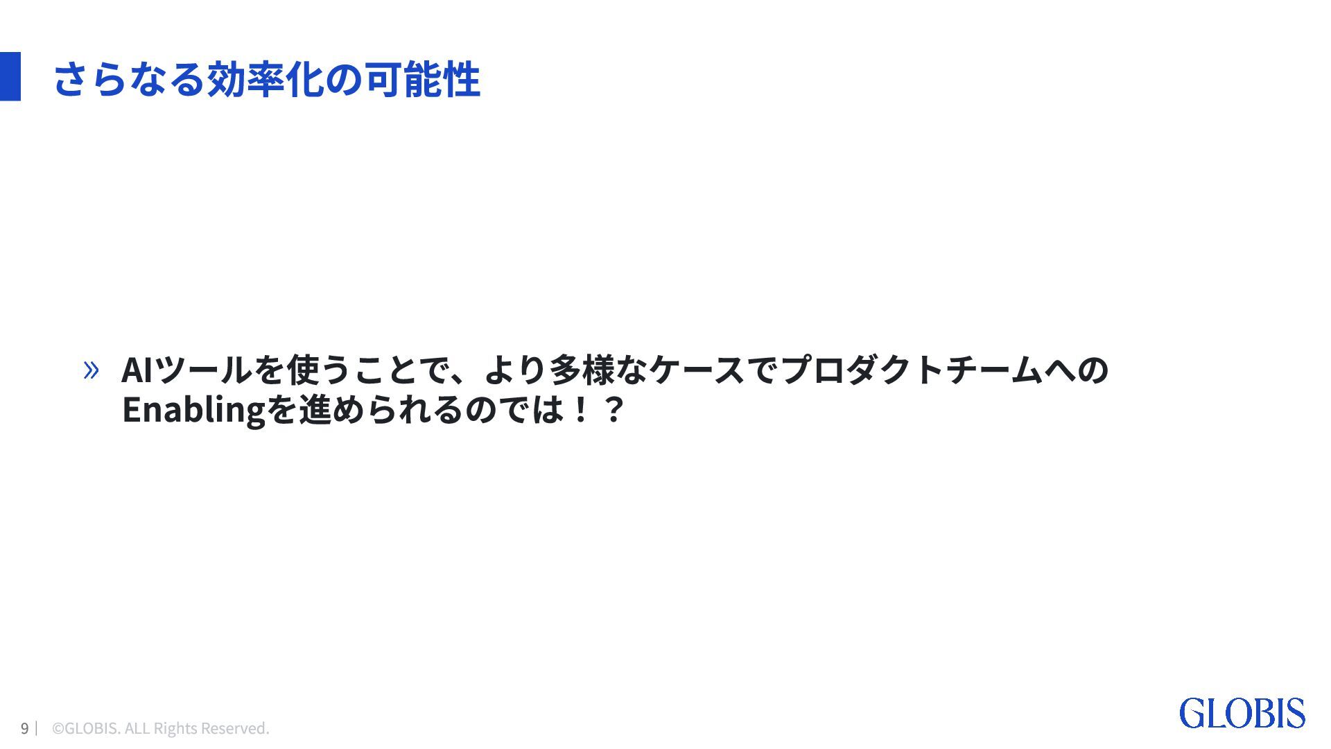 さらなる効率化の可能性 AIツールを使うことで、より多様なケースでプロダクトチームへの Enablingを進められるのでは!? » ©GLOBIS. ALL Rights Reserved. 9│