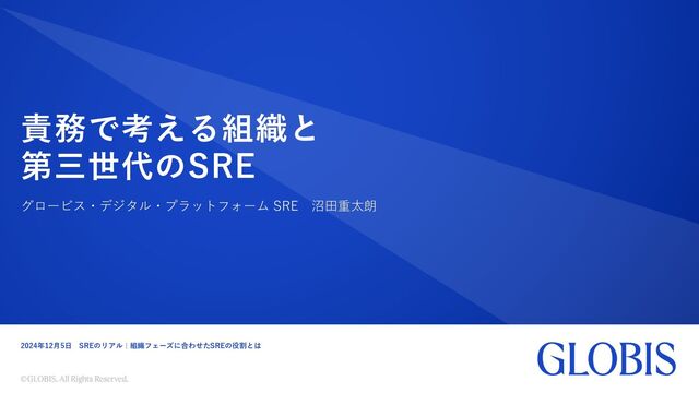 an SRE hat as part of their job, and at least smaller organizations will then stop hiring dedicated SREs. “ (Björn “Beorn” Rabenstein / Grafana Labs) (Emil Stolarsky, Jaime Woo. 97 Things Every SRE Should Know. O'Reilly Media, Inc. 2020. “Chapter 98. The Third Age of SRE“) 第⼀世代 Googleのみが占有的にSREを実践 第⼆世代 SRE booksによる知識拡散、専任SREの増加 第三世代 すべてのエンジニアが部分的にSREに グロービスSREの⽬指す⽅向性は「第三世代」のSRE