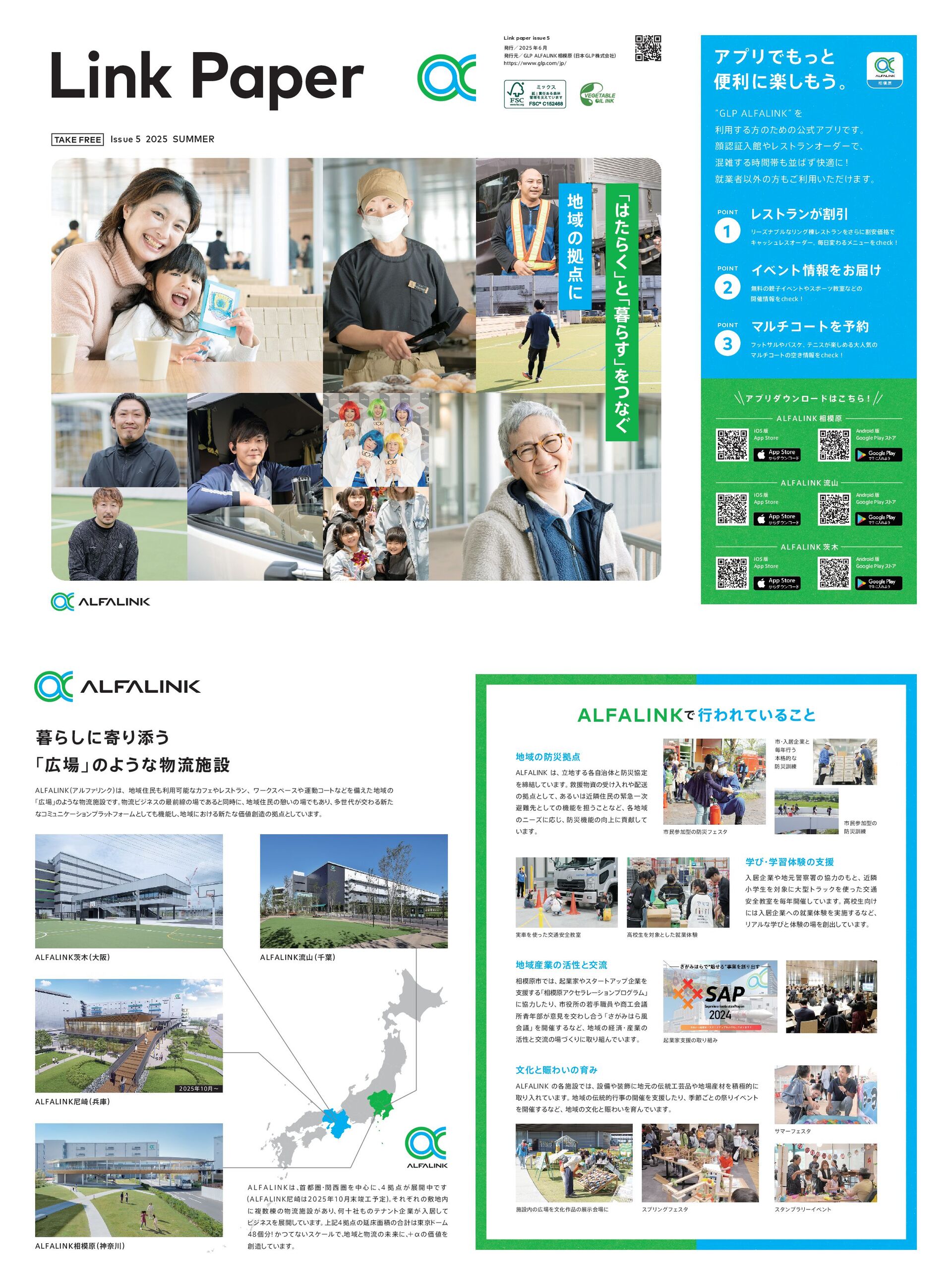ΞϓϦμϯϩʔυͪ͜Βʂ Ϩετϥϯׂ͕Ҿ ϦʔζφϒϧͳϦϯά౩ϨετϥϯΛ͞Βʹׂ҆Ձ֨Ͱ ΩϟογϡϨεΦʔμʔɻ ຖมΘΔϝχϡʔΛDIFDLʂ 1 POINT ΠϕϯτใΛ͓ಧ͚ ແྉͷࢠΠϕϯτεϙʔπڭࣨͳͲͷ ։࠵ใΛDIFDLʂ 2 POINT ϚϧνίʔτΛ༧ ϑοταϧόεέɺ ςχεָ͕͠ΊΔେਓؾͷ Ϛϧνίʔτͷۭ͖ใΛDIFDLʂ 3 POINT Issue 5 2025 SUMMER TAKE FREE "OESPJE ൛ (PPHMF1MBZε τ Ξ J04 ൛ "QQ4UPSF Link paper issue 5 ൃߦʗ ݄ɹ ൃߦݩʗ(-1"-'"-*/, ૬ݪ ʢຊ (-1 גࣜձࣾʣ IUUQTXXXHMQDPNKQ "OESPJE ൛ (PPHMF1MBZε τ Ξ J04 ൛ "QQ4UPSF "OESPJE ൛ (PPHMF1MBZε τ Ξ J04 ൛ "QQ4UPSF "-'"-*/, ૬ݪ "-'"-*/, ྲྀࢁ "-'"-*/, ҵ Β͠ʹدΓఴ͏ ʮʯ ͷΑ͏ͳྲྀࢪઃ "-'"-*/, ʢΞϧϑ Ν Ϧ ϯΫʣ ɺҬॅຽར༻ՄೳͳΧϑΣϨε τϥϯɺϫʔΫεϖʔεӡಈίʔ τͳͲΛඋ͑ͨҬͷ ʮʯ ͷΑ͏ͳྲྀࢪઃͰ͢ɻ ྲྀϏδωεͷ࠷લઢͷͰ͋Δͱಉ࣌ʹɺ Ҭॅຽͷܜ͍ͷͰ͋Γɺ ଟੈ͕ަΘΔ৽ͨ ͳίϛ ϡχέʔγ ϣ ϯϓϥ ο τϑΥʔϜͱ ͯ͠ػೳ͠ɺ Ҭʹ͓͚Δ৽ͨͳՁͷڌͱ ͍ͯ͠·͢ɻ ALFALINKͰ ߦΘΕ͍ͯΔ͜ͱ "-'"-*/, ɺ ཱ͢Δ֤࣏ࣗମͱࡂڠఆ Λక͍݁ͯ͠·͢ɻ ٹԉࢿͷड͚ೖΕૹ ͷڌͱͯ͠ɺ ͋Δ͍ۙྡॅຽͷۓٸҰ࣍ ආઌͱͯ͠ͷػೳΛ୲͏͜ͱͳͲɺ ֤Ҭ ͷχʔζʹԠ͡ɺ ࡂػೳͷ্ʹߩݙͯ͠ ͍·͢ɻ Ҭͷࡂڌ ೖډاۀݩܯॺͷڠྗͷͱɺۙྡ খֶੜΛରʹେܕτϥοΫΛͬͨަ௨ ҆શڭࣨΛຖ։࠵͍ͯ͠·͢ɻ ߴߍੜ͚ ʹೖډاۀͷबۀମݧΛ࣮ࢪ͢ΔͳͲɺ ϦΞϧͳֶͼͱମݧͷΛग़͍ͯ͠·͢ɻ ֶͼɾֶशମݧͷࢧԉ ૬ݪࢢͰɺ ىۀՈελʔτΞοϓاۀΛ ࢧԉ͢Δ ʮ૬ݪΞΫηϥϨʔγϣϯϓϩάϥϜʯ ʹڠྗͨ͠Γɺ ࢢॴͷएख৬һձٞ ॴ੨෦͕ҙݟΛަΘ͠߹͏ ʮ͕͞ΈΒ෩ ձٞʯ Λ։࠵͢ΔͳͲɺ Ҭͷܦࡁɾ࢈ۀͷ ׆ੑͱަྲྀͷͮ͘ΓʹऔΓΜͰ͍·͢ɻ Ҭ࢈ۀͷ׆ੑͱަྲྀ "-'"-*/, ͷ֤ࢪઃͰɺ ઃඋ০ʹݩͷ౷ܳ࢈ࡐΛੵۃతʹ औΓೖΕ͍ͯ·͢ɻ Ҭͷ౷తߦࣄͷ։࠵Λࢧԉͨ͠Γɺ قઅ͝ͱͷࡇΓΠϕϯτ Λ։࠵͢ΔͳͲɺ ҬͷจԽͱΘ͍ΛҭΜͰ͍·͢ɻ จԽͱΘ͍ͷҭΈ ࢢຽࢀՃܕͷࡂϑΣελ ࢢຽࢀՃܕͷ ࡂ܇࿅ ࢢ ɾ ೖډاۀͱ ຖߦ͏ ຊ֨తͳ ࡂ܇࿅ ࣮ंΛͬͨަ௨҆શڭࣨ ߴߍੜΛରͱͨ͠बۀମݧ ىۀՈࢧԉͷऔΓΈ αϚʔϑΣελ εϓϦϯάϑΣελ ελϯϓϥϦʔΠϕϯτ ࢪઃͷΛจԽ࡞ͷలࣔձʹ "-'"-*/,ҵ ʢେࡕʣ "-'"-*/,ྲྀࢁ ʢઍ༿ʣ "-'"-*/,ೌ࡚ ʢฌݿʣ "-'"-*/,૬ݪ ʢਆಸʣ ủ ͨ Β ͘ Ứ ͱ ủ Β ͢ Ứ Λ ͭ ͳ ͙ Ҭ ͷ ڌ ʹ " - ' " - * / , ɺ ट ݍ ɾ ؔ ݍΛத ৺ ʹ ɺ ̐ڌ ͕ ల ։ தͰ͢ ʢ"-'"-*/,ೌ࡚݄ॡ༧ఆʣ ɻ ͦΕͧΕͷෑ ʹෳ ౩ͷྲྀ ࢪ ઃ͕ ͋Γɺ Կ े ࣾͷςφϯτا ۀ͕ ೖ ډͯ͠ ϏδωεΛల։͍ͯ͠·͢ɻ ্هڌͷԆচ໘ੵͷ߹ܭ౦ژ υʔϜ ݸ ʂ͔ͭͯͳ͍εέʔϧͰɺ Ҭͱྲྀͷະདྷʹɺ ʴЋͷՁΛ ͍ͯ͠·͢ɻ ݄ʙ