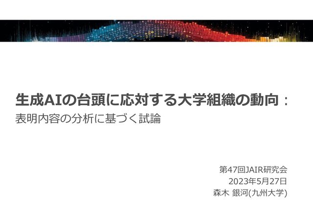 Generative AI”、 https://core.verisk.com/Insights/Emerging-Issues/Articles/2023/January-2023/Week- 4/Generative-AI,閲覧日:2023年5月25日 2 Miyazaki et al, 2023,“Public Perception of Generative AI on Twitter: An Empirical Study Based on Occupation and Usage”(arXiv:2305.09537),https://doi.org/10.48550/arXiv.2305.09537,2023 3 「G7デジタル・技術大臣会合の閣僚宣言における「責任あるAIとAIガバナンス」 のポイント」, https://note.com/akihisa_shiozaki/n/n4c126c27fd3d,2023,閲覧日:2023年5月25日 4 吉田塁研究室,「ChatGPT・AI の教育関連情報まとめ」,https://edulab.t.u-tokyo.ac.jp/chatgpt-ai- resources/,閲覧日:2023年5月25日 5 岡崎直観,2023,「大規模言語モデルの驚異と脅 威」,https://speakerdeck.com/chokkan/20230327_riken_llm,閲覧日:2023年5月25日 6 UNESCO,2023,” ChatGPT and Artificial Intelligence in higher education Quick start guide”,https://www.iesalc.unesco.org/wp-content/uploads/2023/04/ChatGPT-and-Artificial- Intelligence-in-higher-education-Quick-Start-guide_EN_FINAL.pdf 7 HAOMIAO HUANG,2023,“The generative AI revolution has begun—how did we get here?”,https://arstechnica.com/gadgets/2023/01/the-generative-ai-revolution-has-begun-how- did-we-get-here/,閲覧日:2023年5月25日 8 樋口耕一,2020,『社会調査のための計量テキスト分析 ―内容分析の継承と発展を目指して― 第2版』,ナ カニシヤ出版 9 橋本鉱市,2016,「大学の自己認識に関する一試論 : 東大総長の入学式・卒業式辞内容の計量テキスト分析 から」, 東京大学大学院教育学研究科紀要,巻 55, p. 129-138 10 清水強志,2019,「IRに関する全国調査(2019)の結果報告」,第8回大学情報・機関調査研究会, p. 20- 25 11 リチャード・D・ハワード編(2001),大学評価・学位授与機構IR 研究会訳(2012),『IR 実践ハンド ブック 大学の意思決定支援』,「第7章 IRのための技術とツール」,玉川大学出版部,p.274-312 12 柿沼太一,2023,「生成AIの利用ガイドライン作成のための手引き」, https://storialaw.jp/blog/9414, 閲覧日:2023年5月25日 13 戸村 理,2019,「大学組織研究のレビューと展望:関連諸学との対話から」,『教育社会学研究』,104 巻 p. 125-145