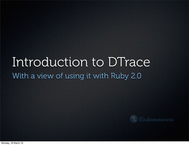 the probe listed. • Provider - Name of the Provider. Providers are used to classify the probes. This is also the method of instrumentation. • Module - The name of the Unix module or application library of the probe • Function - The name of the function in which the probe exists. • Name - The name of the probe.(entry, return) Monday, 18 March 13